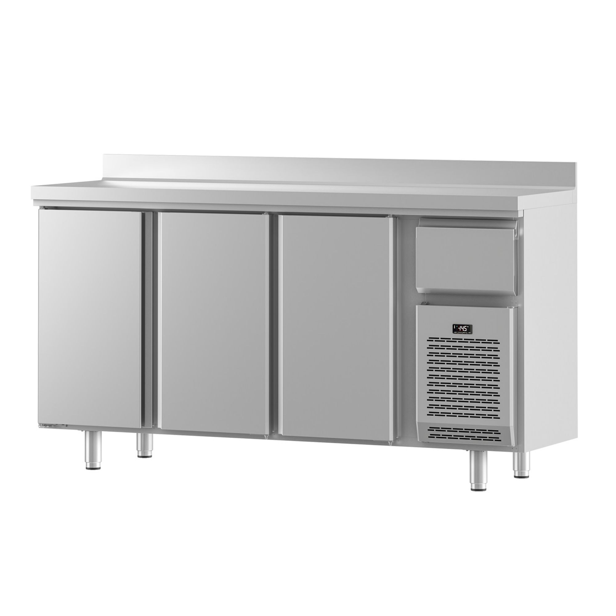 The work surface is AISI 304 stainless steel and includes a 100 mm sanitary backsplash to help keep the rear edge tidy during service. A compact, fully injected structure supports day-to-day durability, while stainless steel legs can be height-adjusted to level the unit on uneven floors—handy in older premises across Ireland.