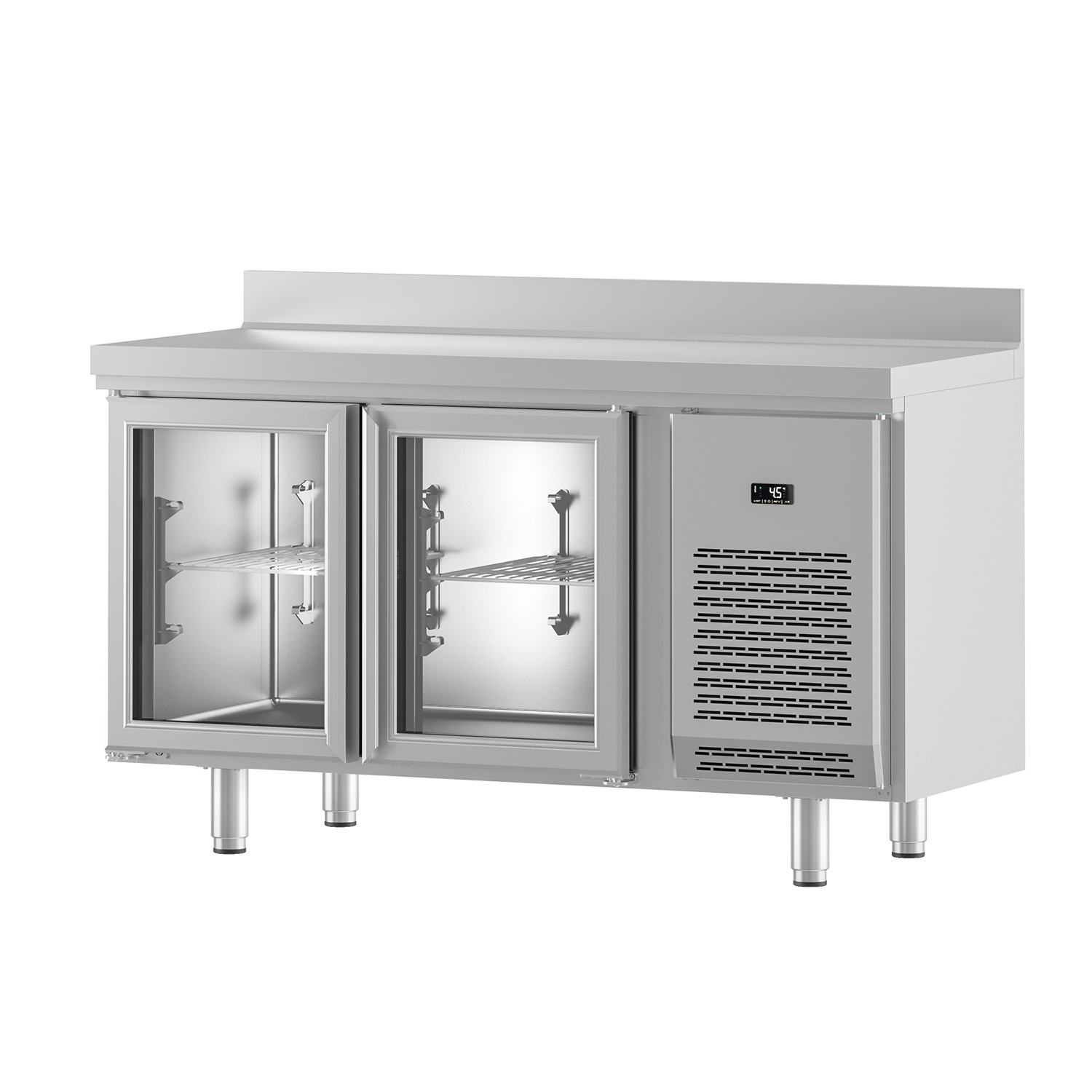 The AISI 304 stainless steel top includes a 100 mm hygienic rear bumper, helping protect walls and making wipe‑downs simpler. A fully injected, compact cabinet structure supports day‑to‑day use, while height‑adjustable stainless legs make levelling straightforward on uneven floors.