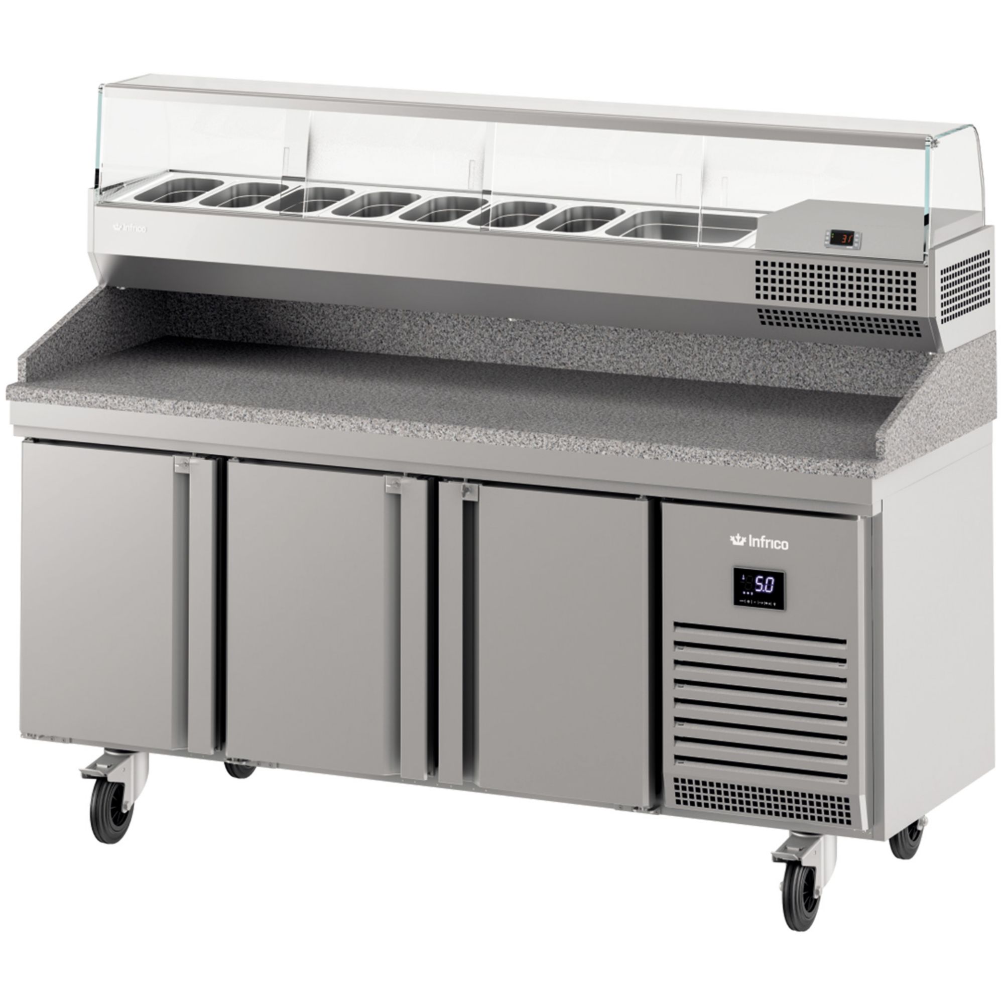 Built with AISI 430 stainless steel and a premium AISI 304 stainless steel countertop, it’s made to handle daily service while staying easy to wipe down between tasks. The compact, fully injected construction and polyurethane-injected worktop help support consistent operation, while the integrated space for G/N 1/3 trays keeps ingredients organised and within reach during busy periods.