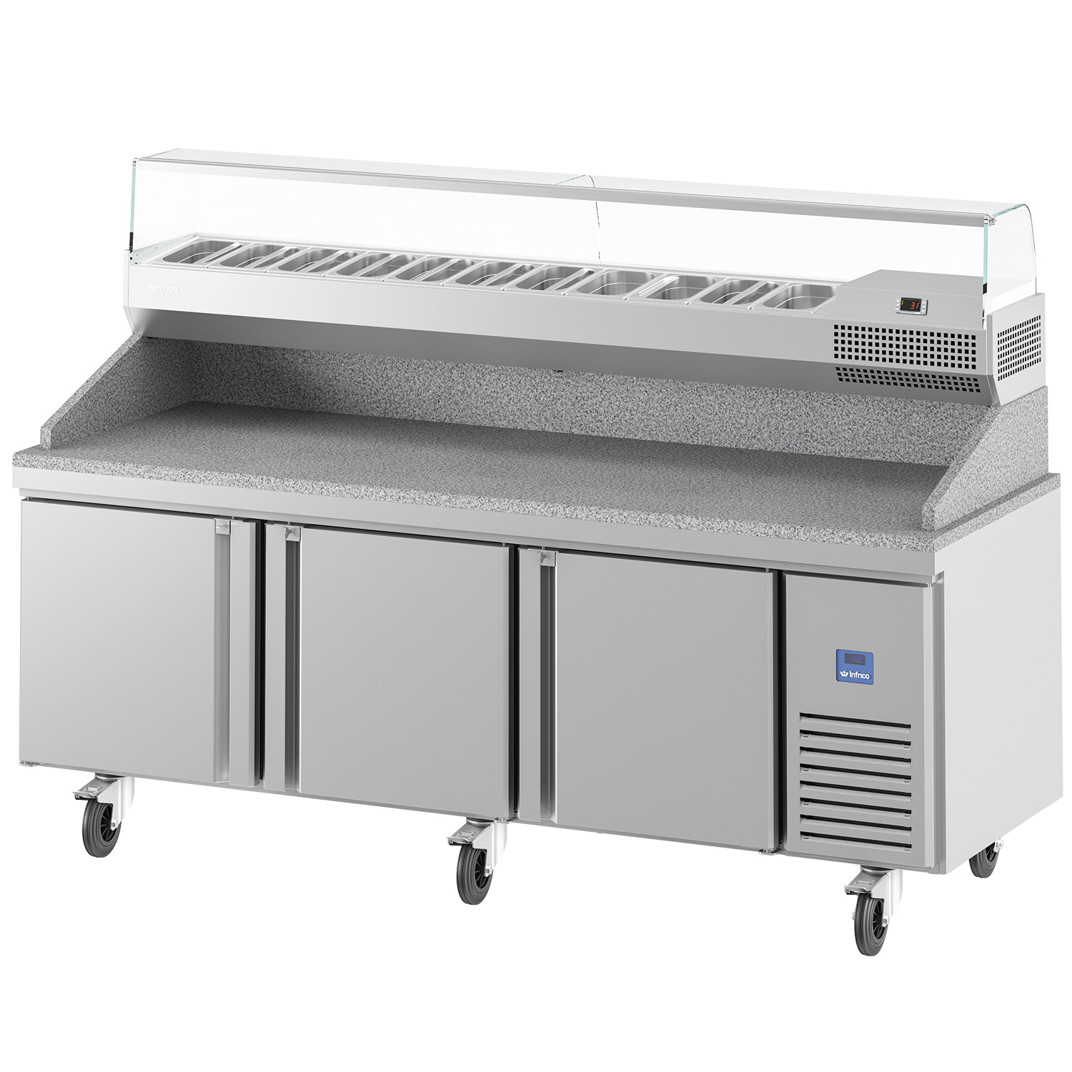 The cabinet is formed in AISI 430 stainless steel, while the countertop is AISI 304 stainless steel for added durability where it matters most. A compact, fully injected structure helps improve overall rigidity, and the injected polyurethane worktop is configured with space for G/N 1/3 trays—ideal for organising toppings and ingredients within easy reach.