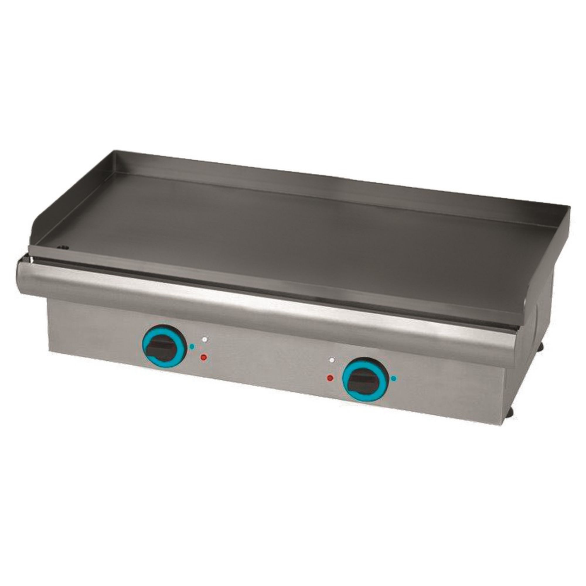 The cooking surface is a 6 mm blued steel plate, treated in a high‑temperature oil bath and finished in black for dependable heat performance during continuous use. Stainless steel armoured heating elements deliver steady heat, while the integrated control thermostat (with on/off switch) allows accurate adjustment from 50°C up to 300°C—ideal for everything from gentle warming through to high‑heat searing.