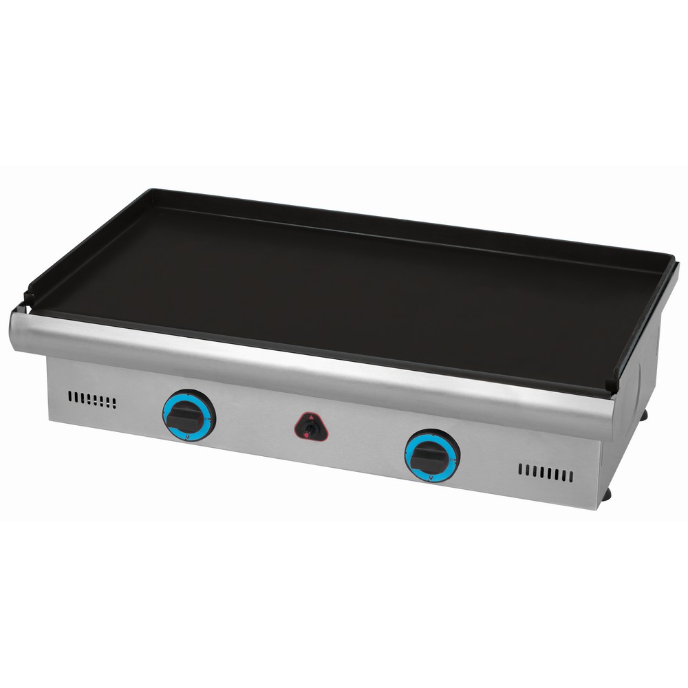 The cooking surface is a 6 mm blued steel plate, treated in a high-temperature oil bath and finished in black. This gives you a hard-wearing griddle top that holds heat well and supports fast, repeatable cooking—ideal for breakfast service, burgers, steaks, vegetables and toasted items.