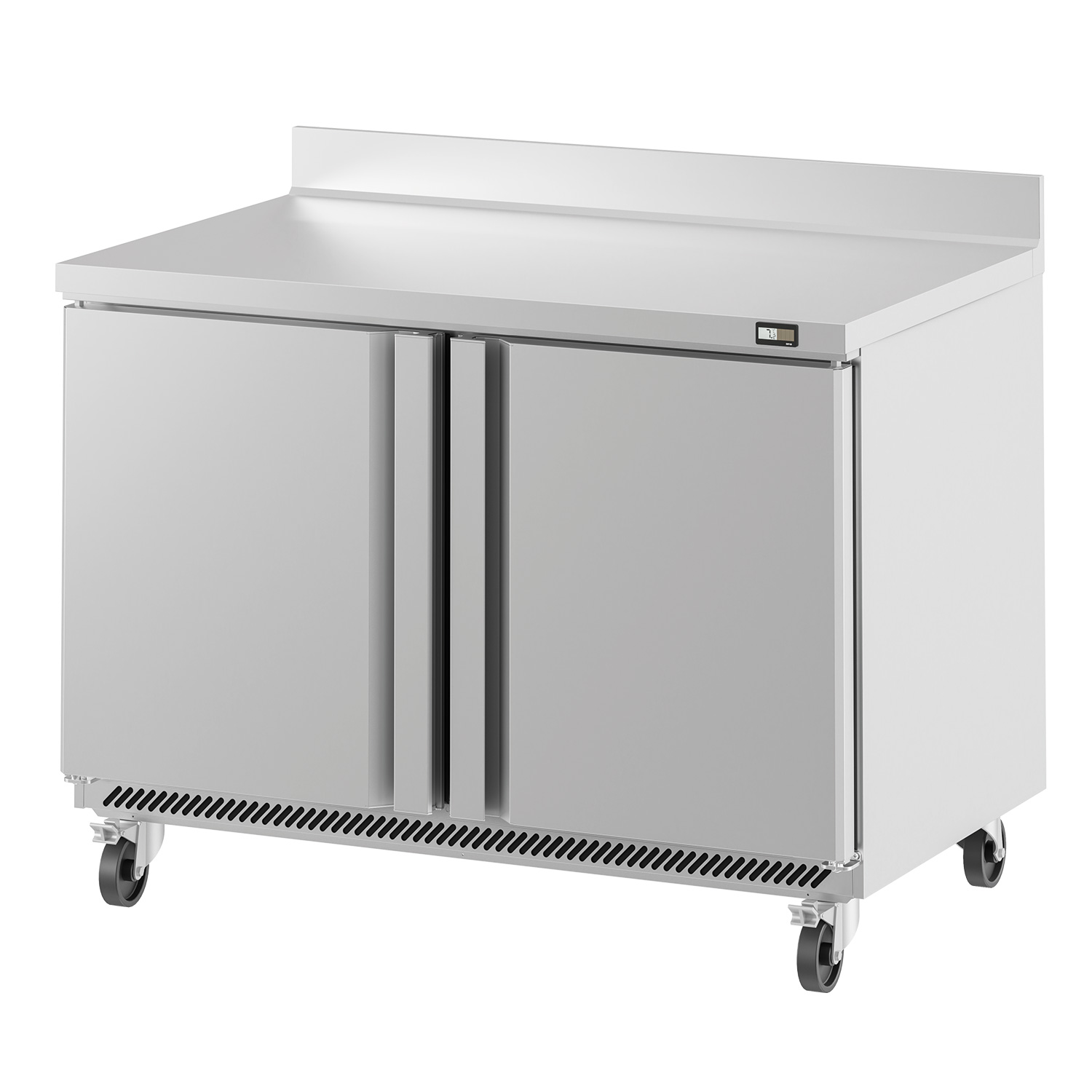 The worktop is made from AISI 304 stainless steel, while the sides are AISI 430 stainless steel, giving you a hard-wearing finish for daily wipe-downs and demanding kitchen routines. Its injected, compact cabinet build supports reliable operation, and 100 mm castors make positioning straightforward, with brakes fitted to the front set to help keep the unit stable during service.
