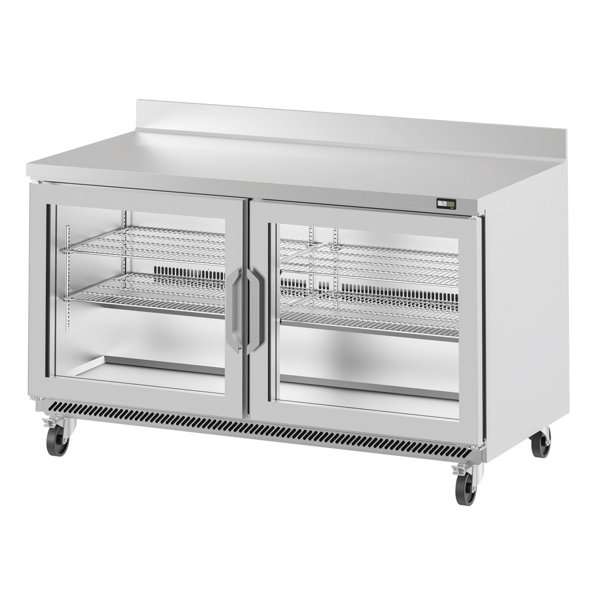 The worktop and sides are formed in AISI 304 stainless steel, with additional AISI 430 stainless steel panels, and the cabinet uses a fully injected compact structure for a solid, easy-clean finish suited to daily commercial use. For manoeuvring during cleaning, it comes on 100 mm castors with brakes on the front set.