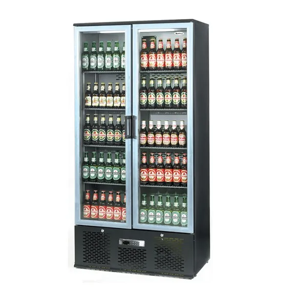 The Infrico ZX20 Upright Double Door Bottle Cooler is a stylish and modern unit, perfect for displaying bottles behind a bar. It is constructed with a tidy laminated exterior and interior that will entice customers to make purchases. Equipped with a standard lock to ensure security, it also features double glazed glass doors to allow for easy viewing of products.