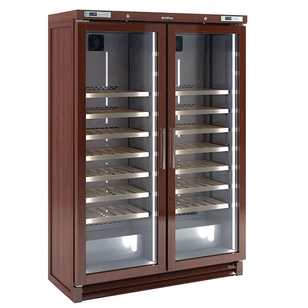 The Infrico EVV200MX Upright Double Door Wine Cellar 700L is part of a range of wine cellars, glass frosters, and refrigerated display units from Infrico, designed for the busy professional kitchen and food outlet. This product from a leading brand features a wood exterior and includes seven adjustable painted steel shelves per door. The interior is made of grey plastic-coated steel, and it comes equipped with a digital controller and temperature display as standard.