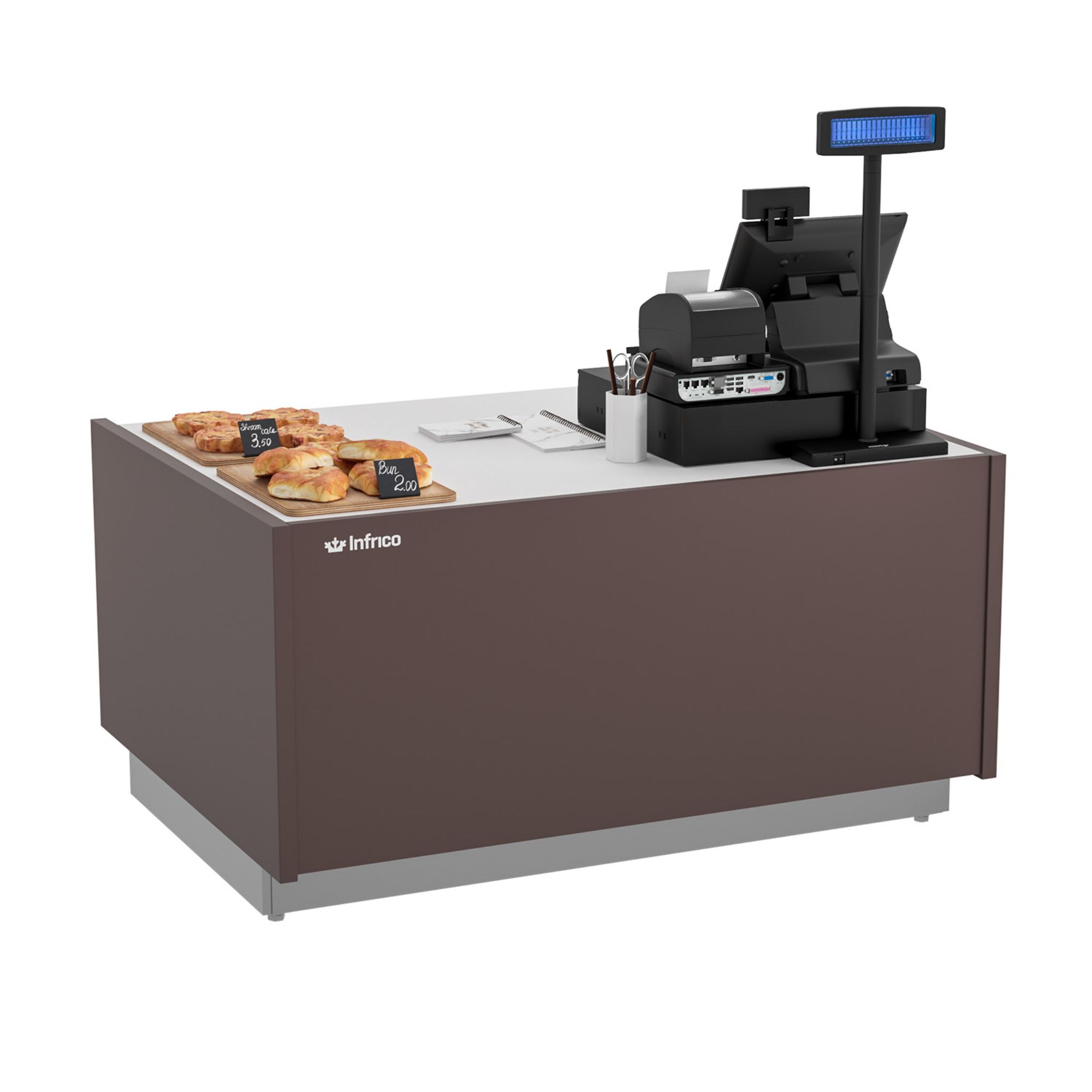 The straight front glass gives customers an unobstructed view of your pastries and sweet treats, while the securised side glazing adds extra confidence for high-traffic service areas. A white compac quartz worktop (also used for the bag support) brings a premium, hard-wearing surface that’s easy to keep looking tidy during service.