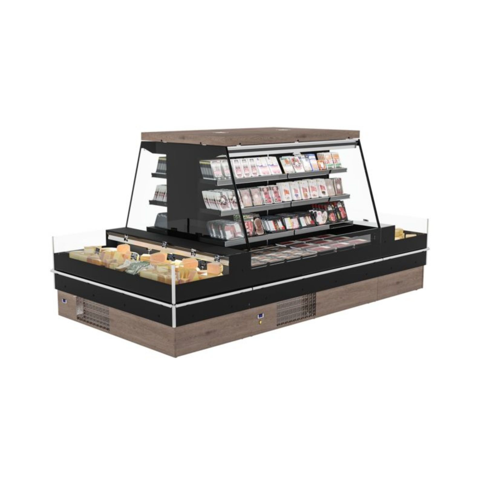 This display case is built as one indivisible piece of furniture, yet internally it’s organised into four independent refrigerated enclosures: two 1800-height wall units and two low, glass promotional headers. The multideck wall includes three staggered shelves, plus a night curtain to help protect product temperatures outside busy service periods.