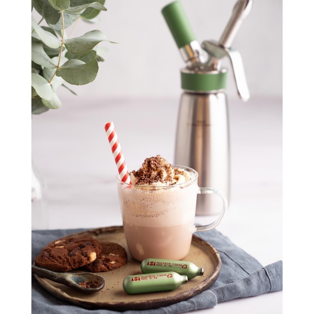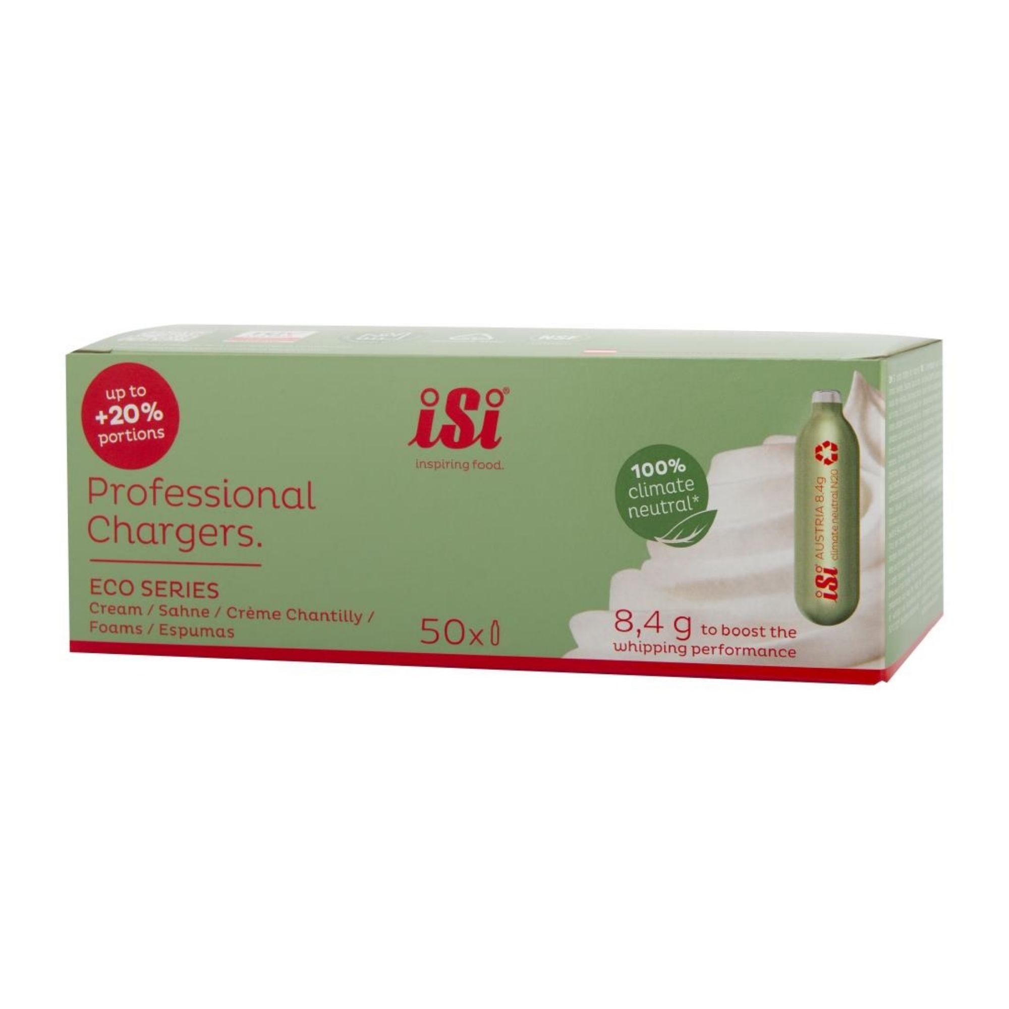 Top your desserts and beverages to perfection with iSi Professional ECO Series cream whipper charger bulbs - a sustainable alternative to standard charger bulbs for your kitchen. Each of the 50 chargers in this pack contains 8.4g of pure N2O, suitable for cream whippers, ensuring consistent performance for various culinary applications.