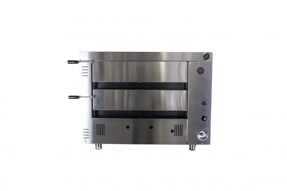 Built to a high standard, the doors and fascia are made from stainless steel for long-lasting aesthetics, and the baking chamber is also entirely made from steel. High-quality stainless steel burners ensure high performance, longevity, and excellent economy. The Kebab King gas oven can operate on natural or LPG gas. Removable feet allow for a reduced height of 79 cm, enabling it to fit through a standard door during delivery.