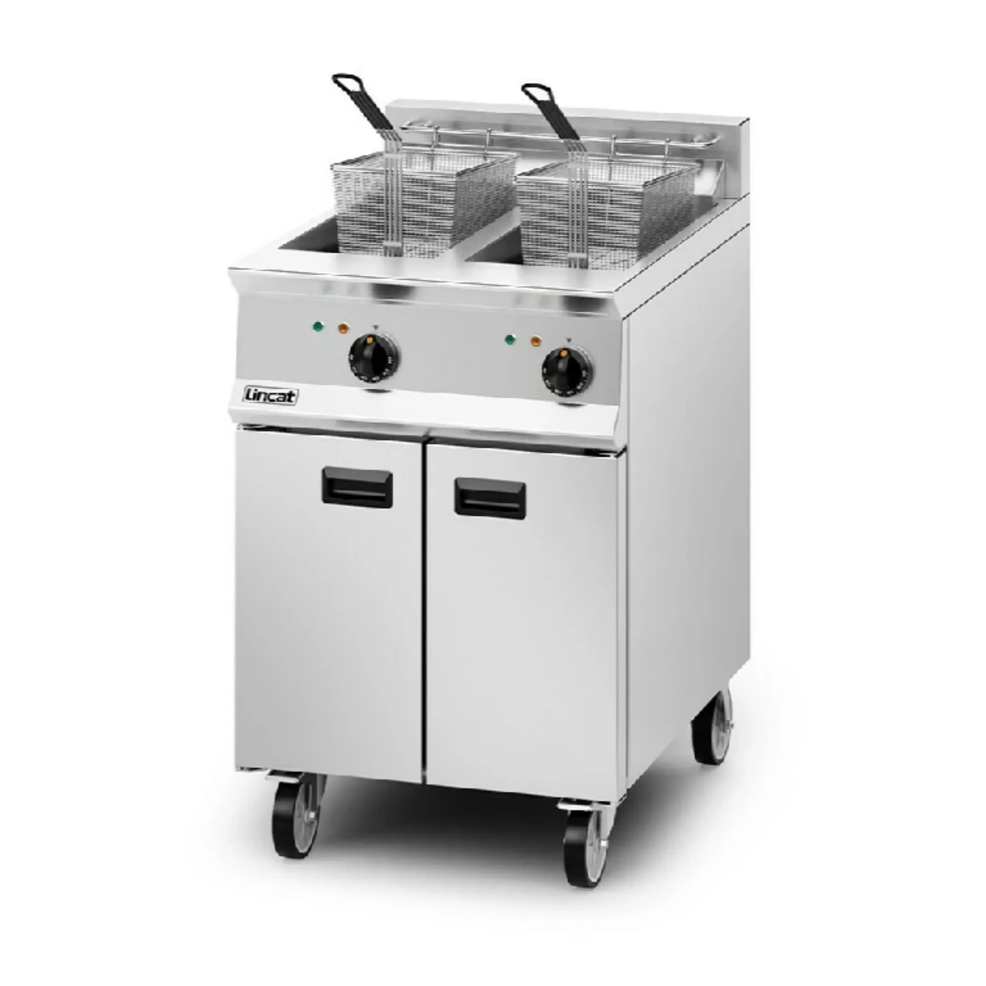 Fry delicious food accurately with the Opus 800 Twin-Tank Free Standing Electric Fryer, which features two independent fryer tanks for greater versatility. With precise thermostatic control, this fryer is ideal for a variety of busy commercial kitchens, whether it's a large pub or a restaurant. The hinged, lift-out element with a safety interlock makes it easy to access and clean the tank.