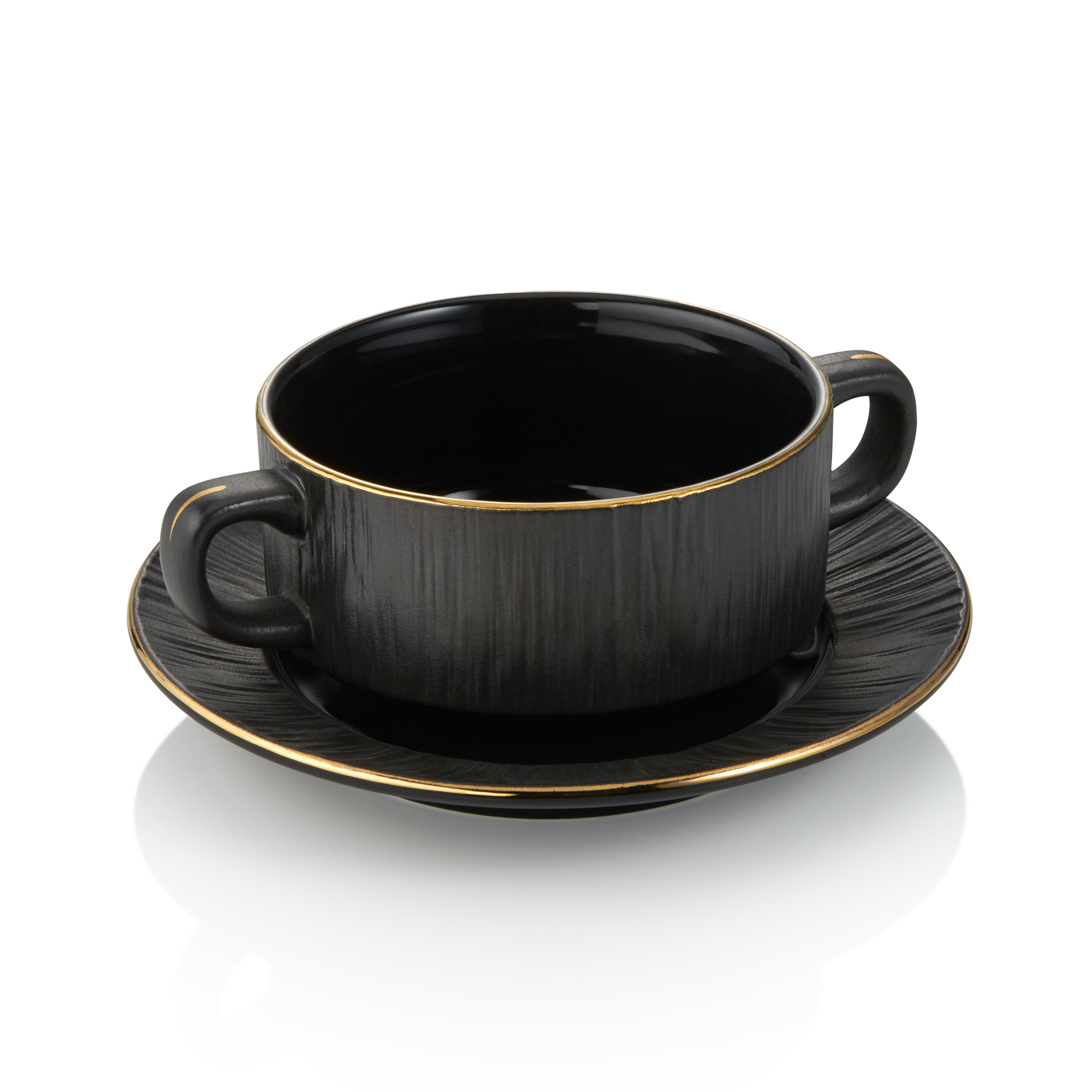 A striking way to serve soups, broths and tasting portions in busy dining rooms, the MAYA KURO soup cup and saucer set stands out on any table. Finished in deep black porcelain with a delicate gold rim, each 250 ml cup (Ø 10.5 cm) pairs with its saucer to frame presentation and keep service tidy. Purpose-built for commercial venues, it blends style with everyday practicality.
