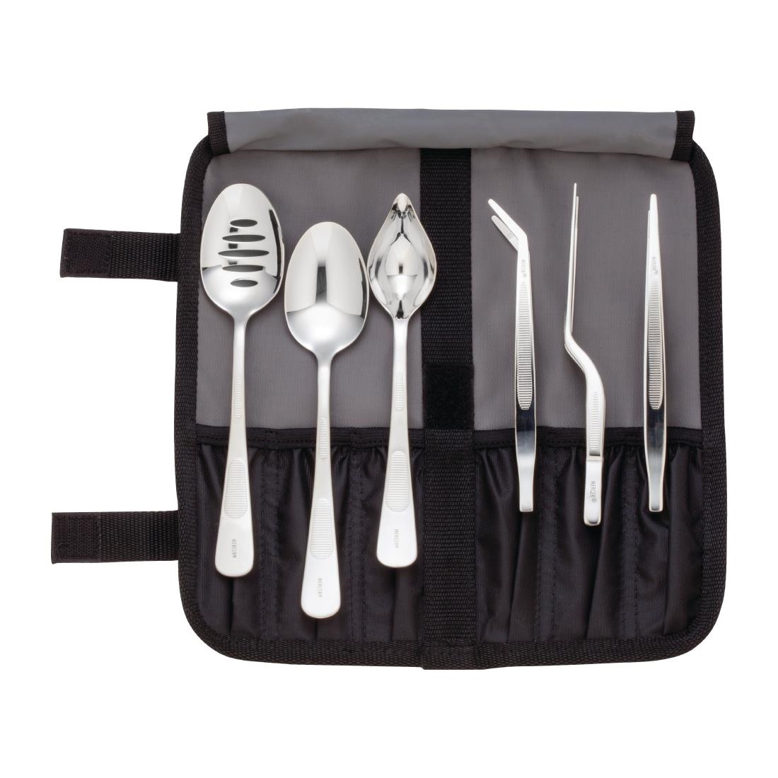 This precision plating tool set is for small or delicate items too delicate to be touched by hands such as: flowers, herbs, micro-greens, and sauces. The contents included are 4-1/4" Offset Spatula, Saucier Spoon with Spout, Plating Spoon with Slotted Bowl 9", Plating Spoon with Solid Bowl 7-7/8", Precision Offset Tongs 6-1/2", Precision Tongs with Curved Tip-6-1/8", Precision Straight Tongs 9-3/8", and Small Roll with Velcro enclosure tabs. These products in this set have machined finger grips and grooved tips and are 18-8 Stainless Steel products.