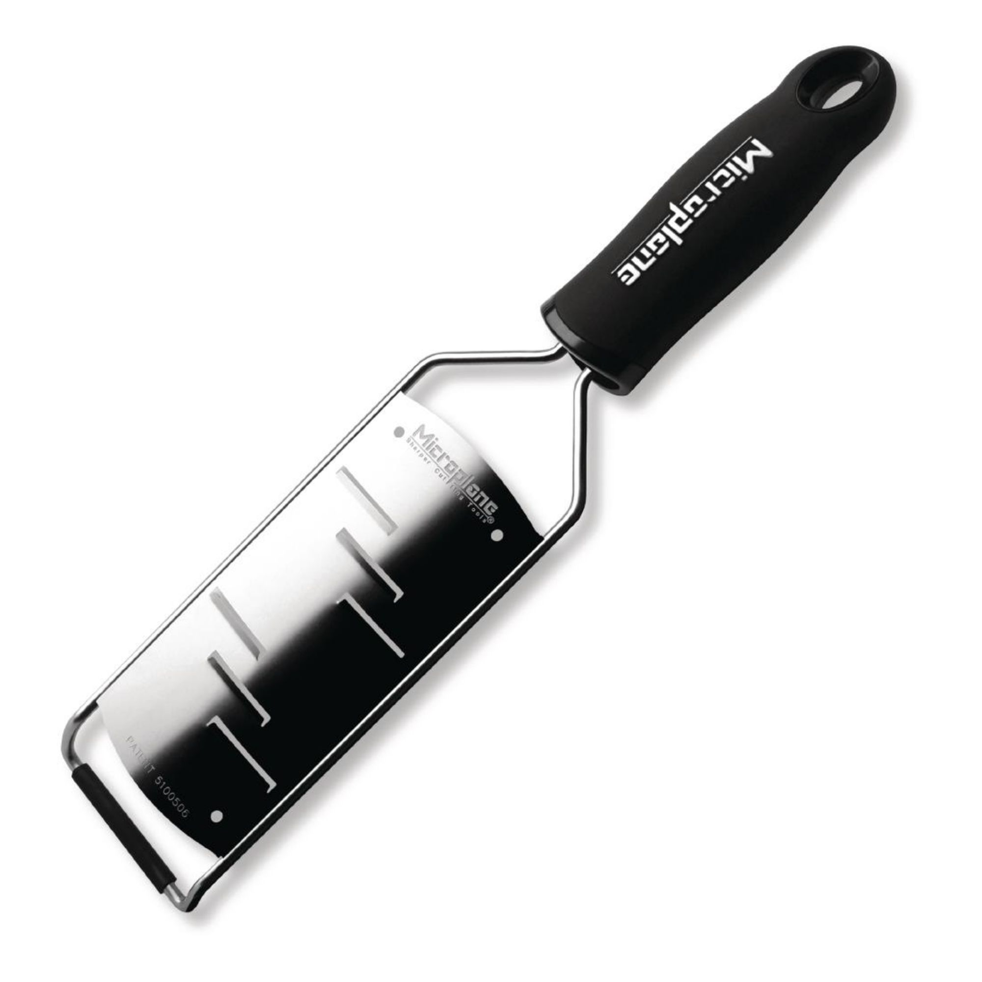 Designed with both the professional chef and home cook in mind, the extensive, paddle-shaped Gourmet Series was enhanced in design and function. It looks sleek and offers ample grating and shaving surface, soft-touch handles, plus non slip rubber ends for added stability. Handsomely crafted, the high-performance Gourmet Series features seven grating options: Coarse, Medium Ribbon, Fine, Large Shaver, Extra Coarse, Star blade, and Ultra Coarse.