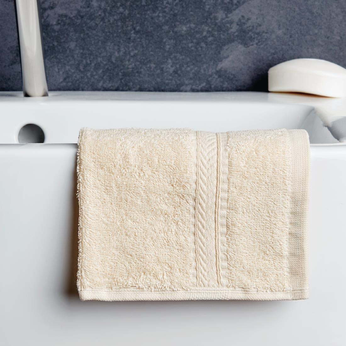 The cream-coloured Nova Colour Face Cloth is a luxurious bathroom accessory that will feel soft against your guest's skin. The 100% cotton cloth allows for face cleansing and exfoliation and has the feel of a high quality product courtesy of a weight of 485gsm. Add a Nova Colour Bath Sheet, bath towel, hand towel and bath mat for a fully-co-ordinated look to your bathroom décor.