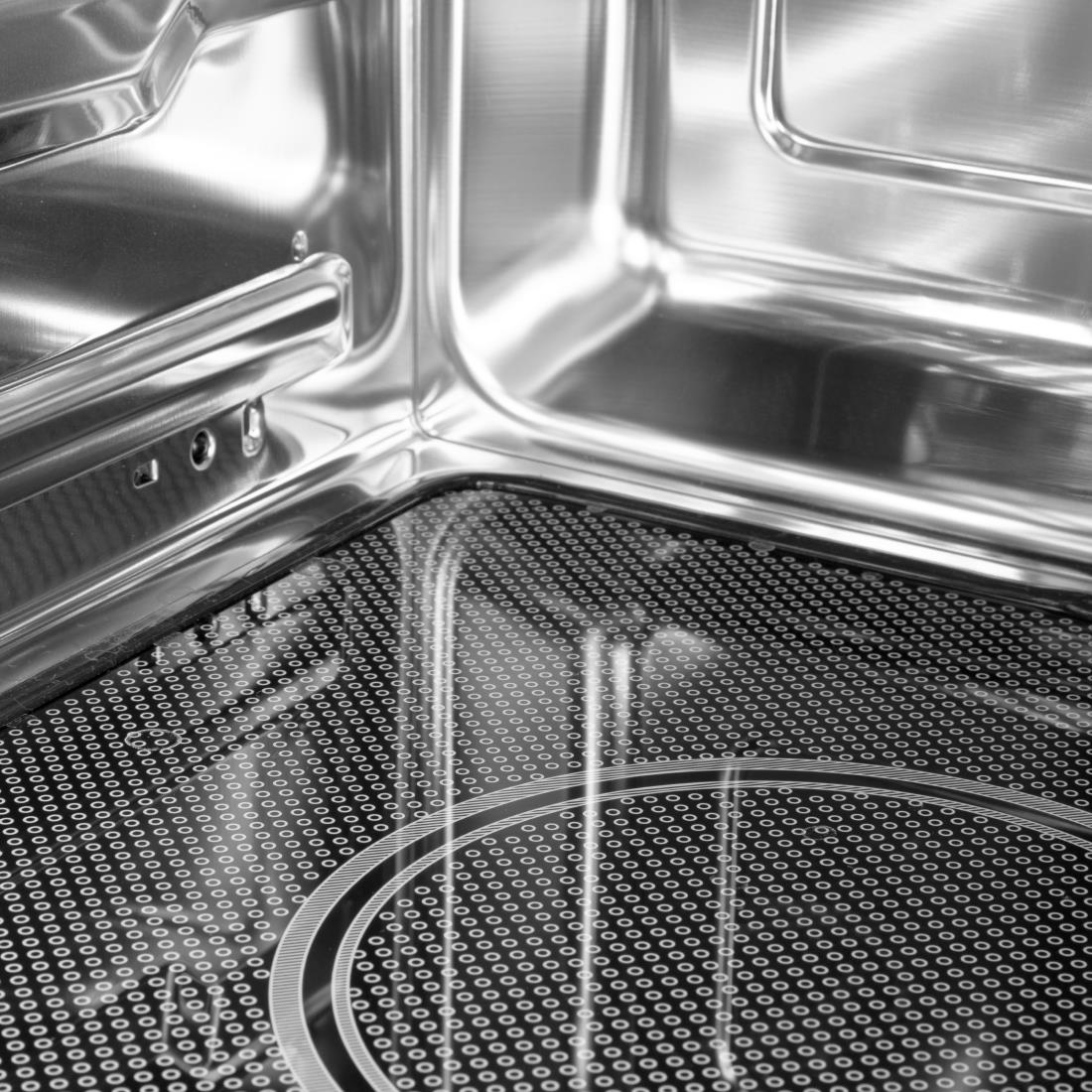 Powerful yet highly efficient, the light-duty Essentials 1000W microwave is a fantastic combination of commercial-grade performance and value. It is a great solution for quickly cooking, defrosting, and reheating food. Like most commercial microwaves, the Essentials microwave has a flat bed, meaning it's designed to fit larger rectangular microwave-safe dishes and containers inside the 25-liter cavity. The absence of a turntable also means fewer moving parts and easier cleaning, which is a valuable time-saver in any kitchen.