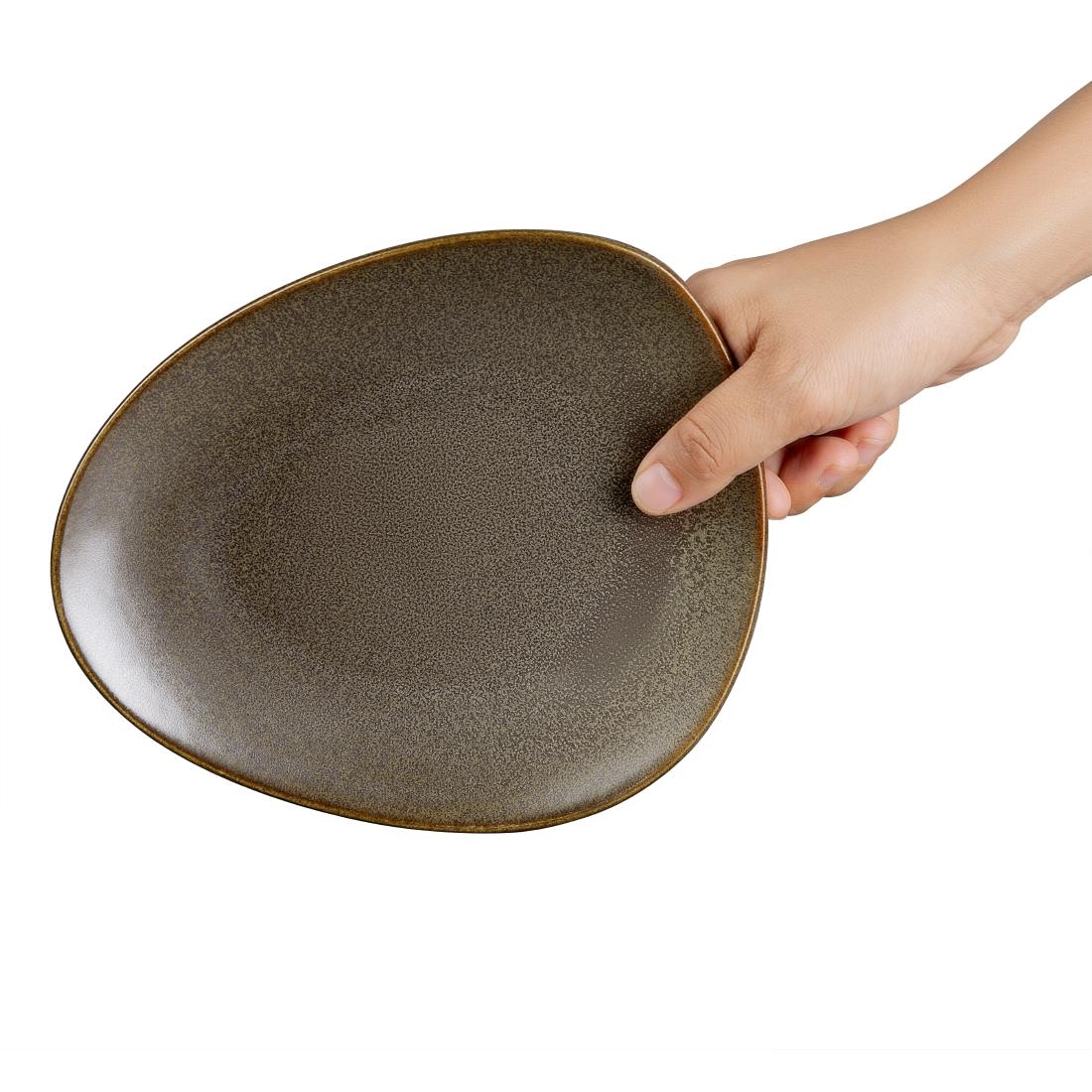 Crafted from porcelain, these Olympia Ember Mahogany triangle plates are backed by a lifetime edge-chip warranty for added strength and durability. Their practical design makes them easy to stack and store, while the unglazed foot helps prevent them from slipping.