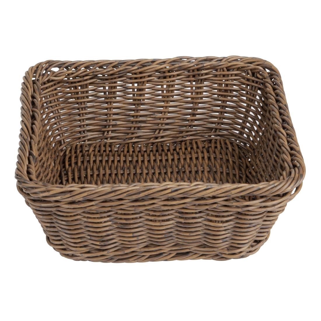 Introducing the Olympia square serving basket, crafted from durable polywicker in a dark brown finish. Measuring 230x230mm in size, it's ideal for displaying breads, pastries and other baked goods at breakfast buffets or during lunch and dinner service. The rustic, farmhouse-style design enhances the visual appeal of your food presentation, helping draw attention to what's on offer. Once service is finished, simply place the basket in the dishwasher for easy cleaning.