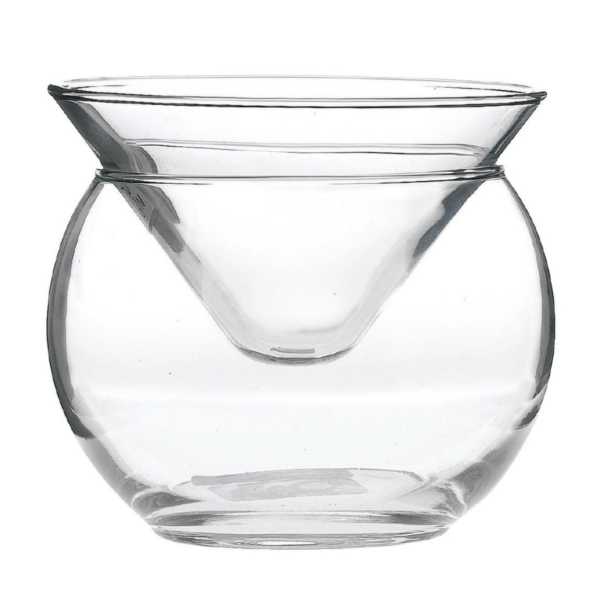 This sleek and stylish 2 piece item consists of a traditional martini shaped top without a stem and a chiller bowl. This unique item is the perfect way to keep your favourite cocktail cool, no matter how hot it gets. Not to forget, the thick glass bowl prevents ice from melting! It's a versatile performer. When you're not enjoying a martini, it seamlessly transitions into a stylish vessel for serving desserts or appetizers. Imagine presenting chilled fruit salads or delectable sorbets, in this chic chiller bowl.