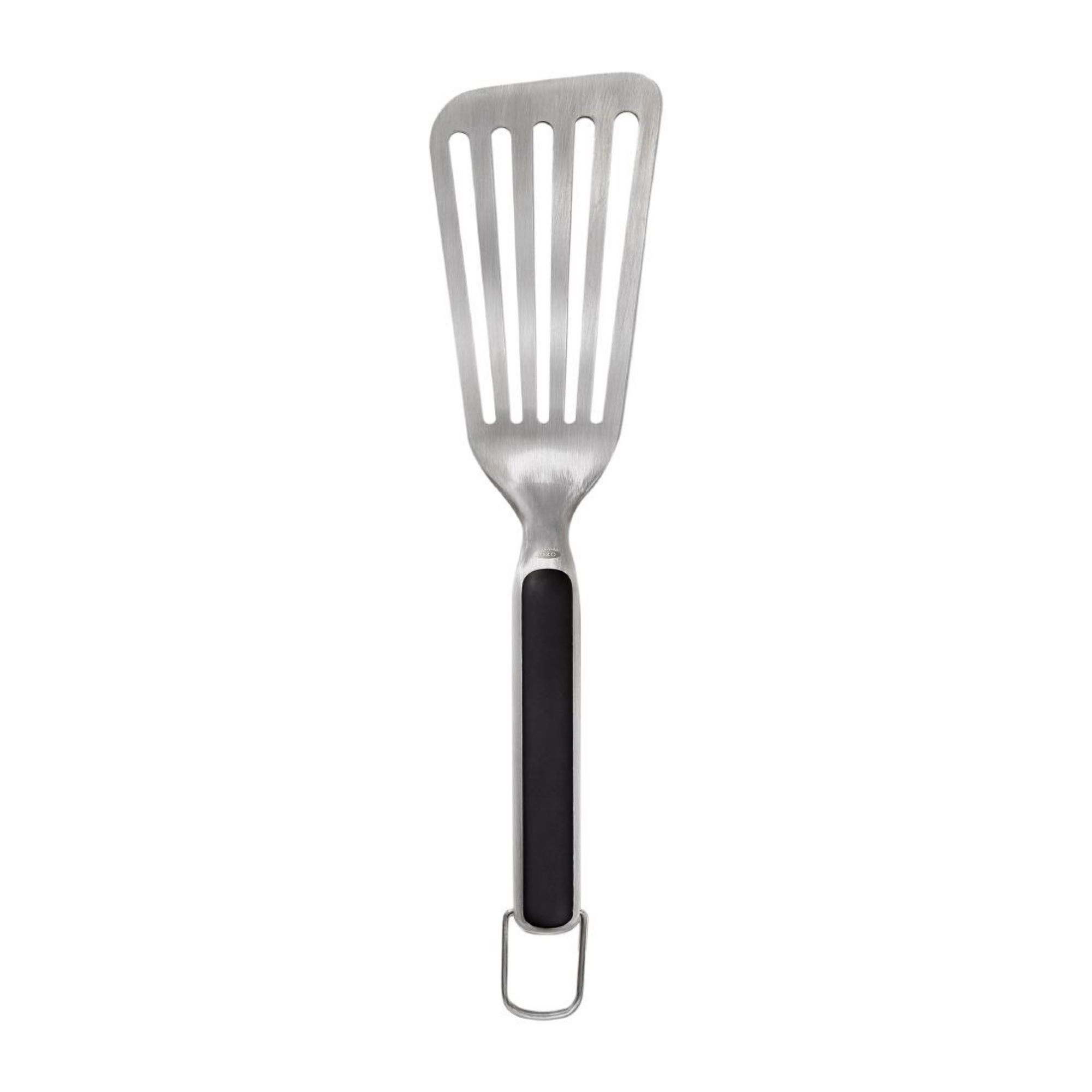 Whether you're grilling salmon filets, thick-cut pork chops, or juicy burgers, the OXO Good Grips grilling precision turner is a great solution for saving time. The thin, bevelled head slides right under food, while the sturdy stainless steel construction provides support for fumble-free flipping and transferring. With a comfortable, non-slip grip, plus a convenient hanging ring for grill-side storage, you'll reach for this stainless steel spatula no matter what's on the menu. Dishwasher safe.