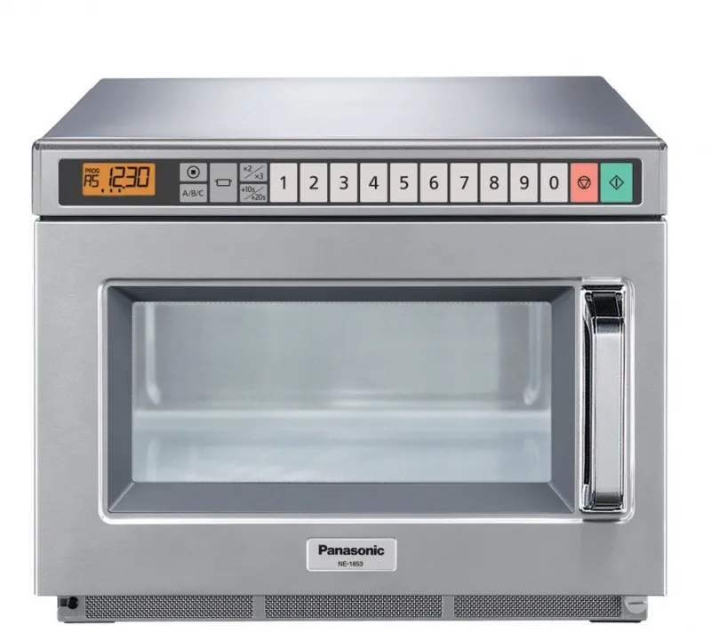 The Panasonic NE-1853 is a medium to high powered commercial microwave with 1800 watts. Panasonic microwaves are robust, featuring a stainless steel body and cavity, and are simple to use. The NE-1853 is inexpensive for a machine produced in this power class by such a well-respected manufacturer. It comes with a good range of features, including touch controls, 20 preset cook programs, 3 power levels, a double quantity function, and 2 and 3 stage cooking for more sensitive foods.