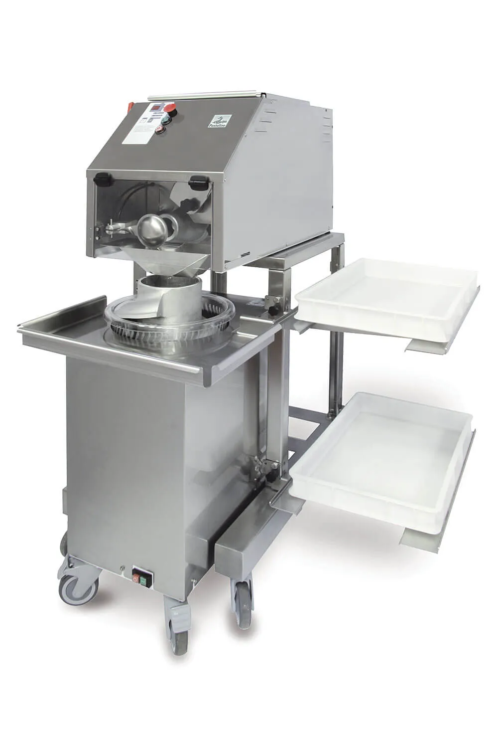 This automated system offers a marvelous time-saving facility for high-output kitchens and bakeries. Available as a combined system or as two separate units, the dividing machine accurately portions the mix into pieces, and the rounder machine then rolls them into tight balls. This facility reduces labor costs and helps produce a consistent product. The portion size produced by the divider is regulated either by a timer or by a feeler pin for added accuracy, with both facilities available on the same machine.