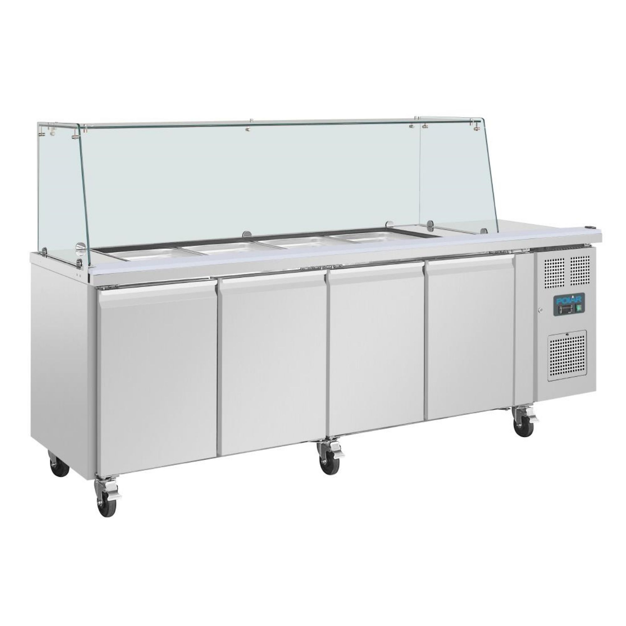 Ensure efficient and hygienic food storage for your most-accessed ingredients with the Polar U-Series refrigerated four door saladette counter. Designed to fit up to four full size (1/1GN) gastronorm containers across the top and up to 476 litres of storage behind the four doors, the counter offers an impressive capacity - perfect for busy professional kitchens.