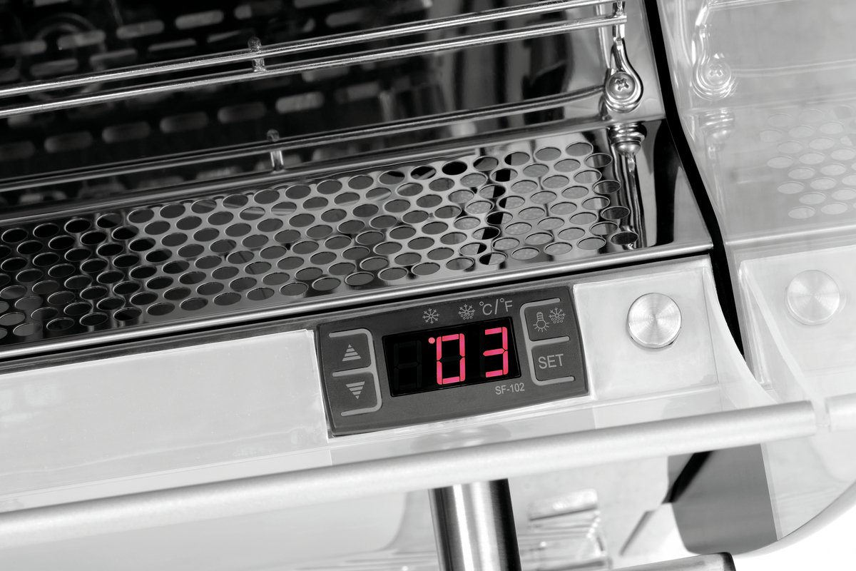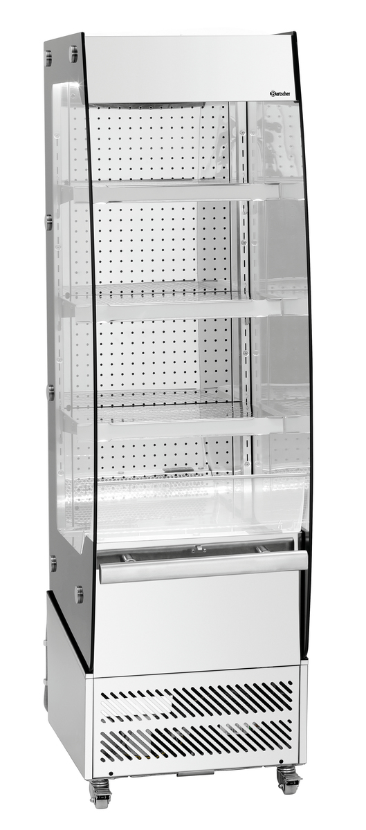 The mobile refrigerated wall shelf is designed for the presentation of goods across four levels. It features three height-adjustable shelves, allowing for individual and needs-based assembly.