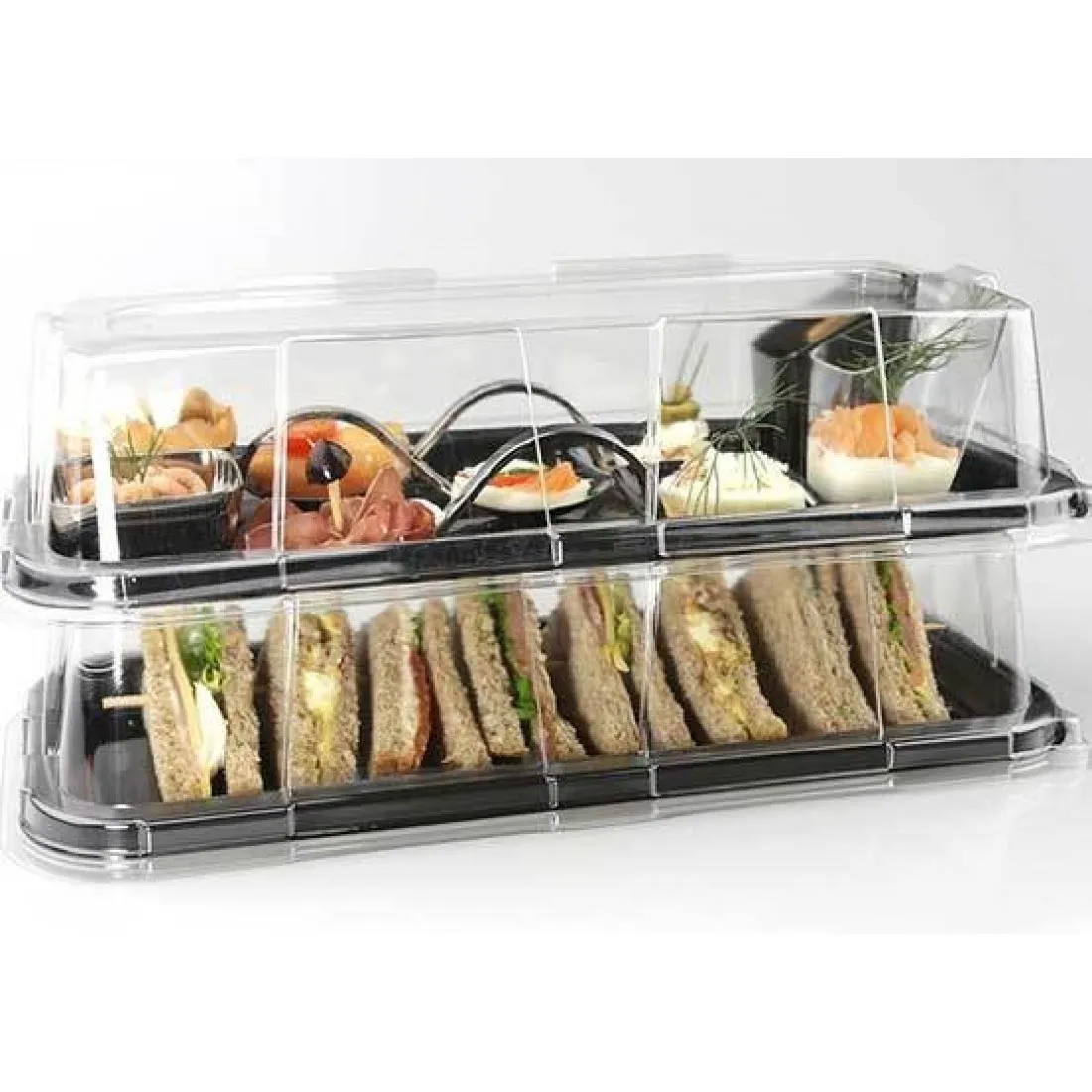 An elegant, black plastic buffet platter for presenting sandwiches, snacks, pastries and cakes. Suitable for catering private and corporate events.