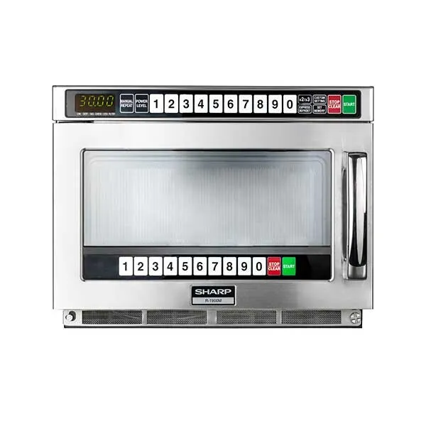 The Sharp R1900M Heavy Duty Microwave Oven is constructed with a stainless steel exterior and interior. It is equipped with a 1900-watt output, making it ideal for high-output needs in most catering establishments.