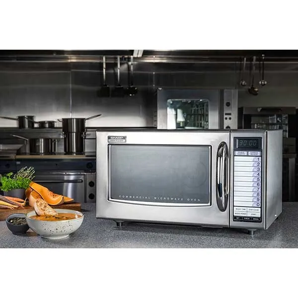 The Sharp R21AT Medium Duty Microwave Oven is constructed with a stainless steel exterior and interior. It is equipped with 11 power levels and 20 programmable memory settings.