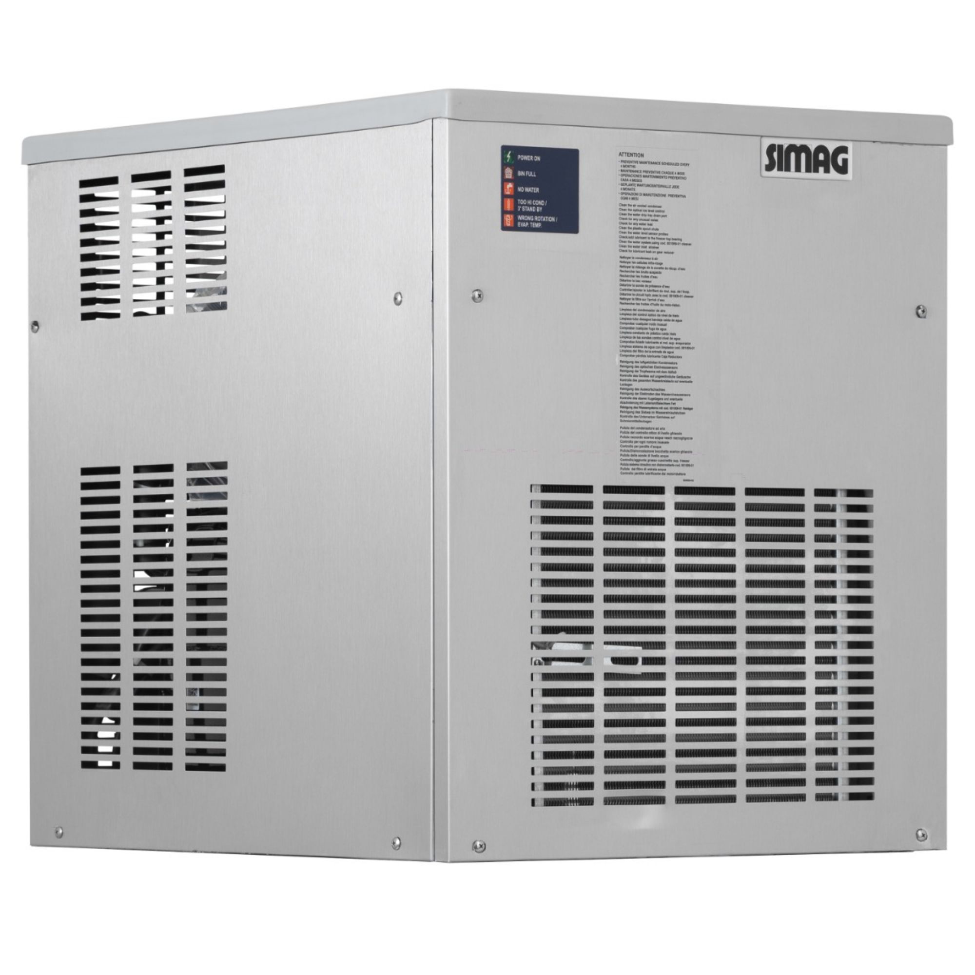 High grade 441 stainless steel (scoth brite) exteriorFood safe plastic interiorFront vented can be built inElectronic controlsProduces flaked iceAir cooled (water cooled version avaliable POA)Easily accessible componentsRefrigerant R290 Brand: SIMAG Size (H x W x D): 531 x 564 x 536 Weight: 49.0 Finish: Stainless Steel Refrigerant: R290 Power Consumption (W): 700W