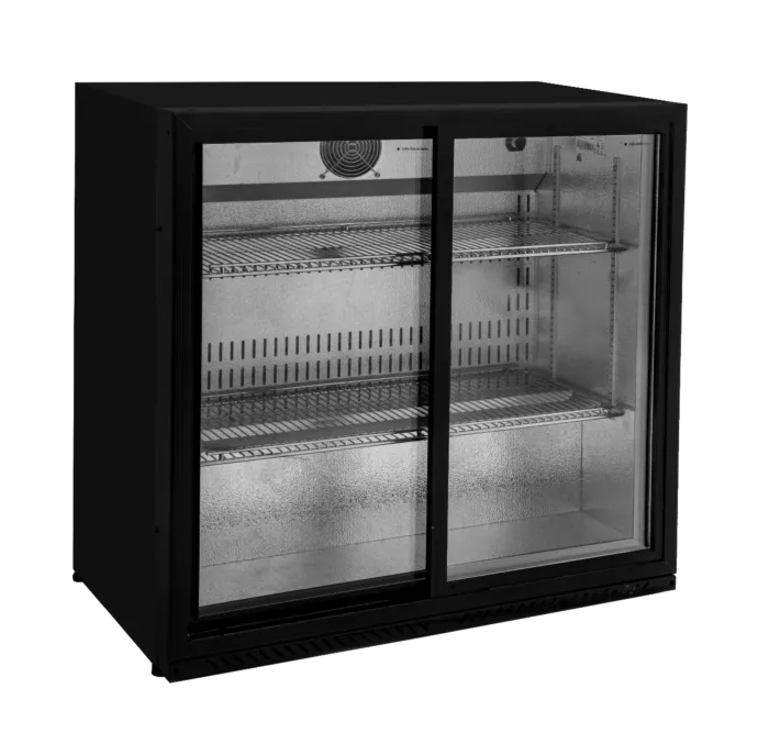 The Sterling Pro BBS220SLIDING Sliding Double Door Bottle Cooler is a stylish unit designed for easy installation behind and under counters. It features two doors and two shelves, allowing for efficient organization of stock.