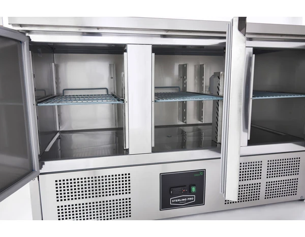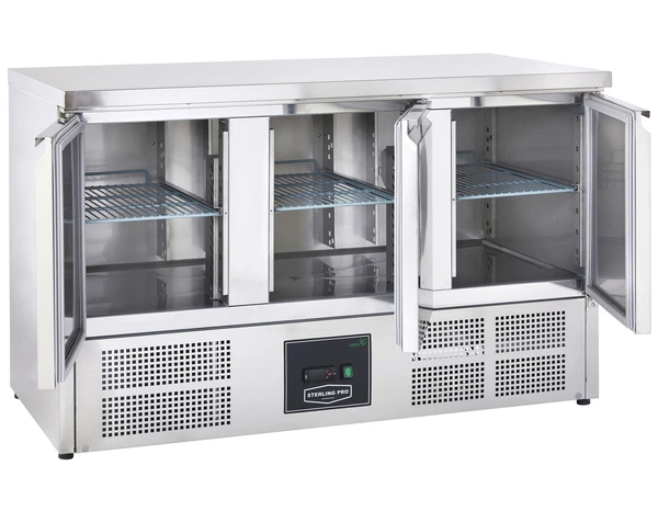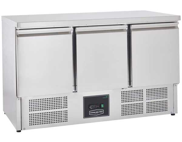 The Sterling Pro SPU303 refrigerated counter is designed to keep your fresh ingredients safely chilled without being costly. This three-door design offers a substantial amount of internal chilled storage space, along with the benefit of over 1350mm of prep space on top. By using the most efficient environmentally friendly refrigerant, the SPU303 minimizes running costs. Additionally, the catering-grade stainless steel construction allows for hygienic food preparation.