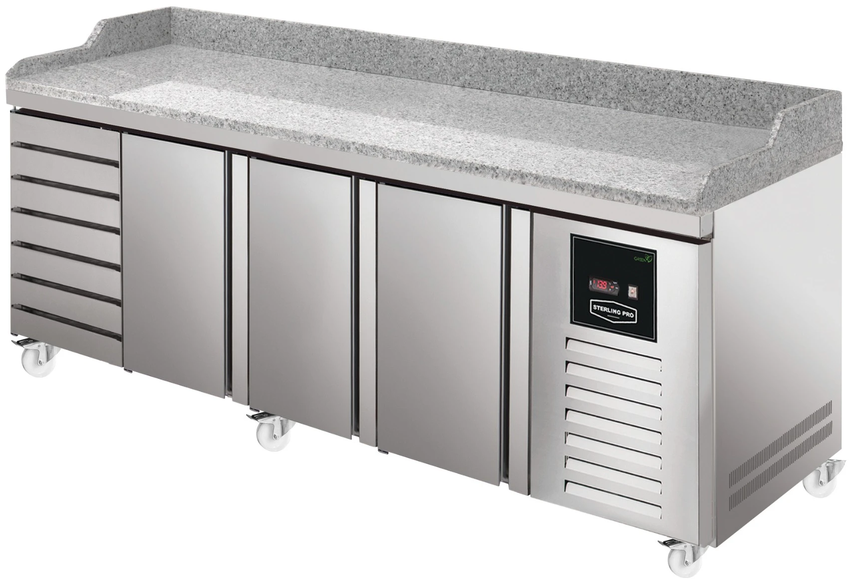 The Sterling Pro Green SPI-8-250-37 Granite Top 800mm Counter is the perfect choice for pizza professionals. The extra-deep granite worktop offers ample space for large pizza bases and ingredients, ensuring you have the capacity needed for busy service times. It features seven ambient drawers complete with food-safe PVC inserts, allowing you to safely store dough balls or pre-prepared bases. Additionally, the three doors open up to a large refrigerated storage area for fresh ingredients and toppings. Three 600x400mm shelves are provided as standard.