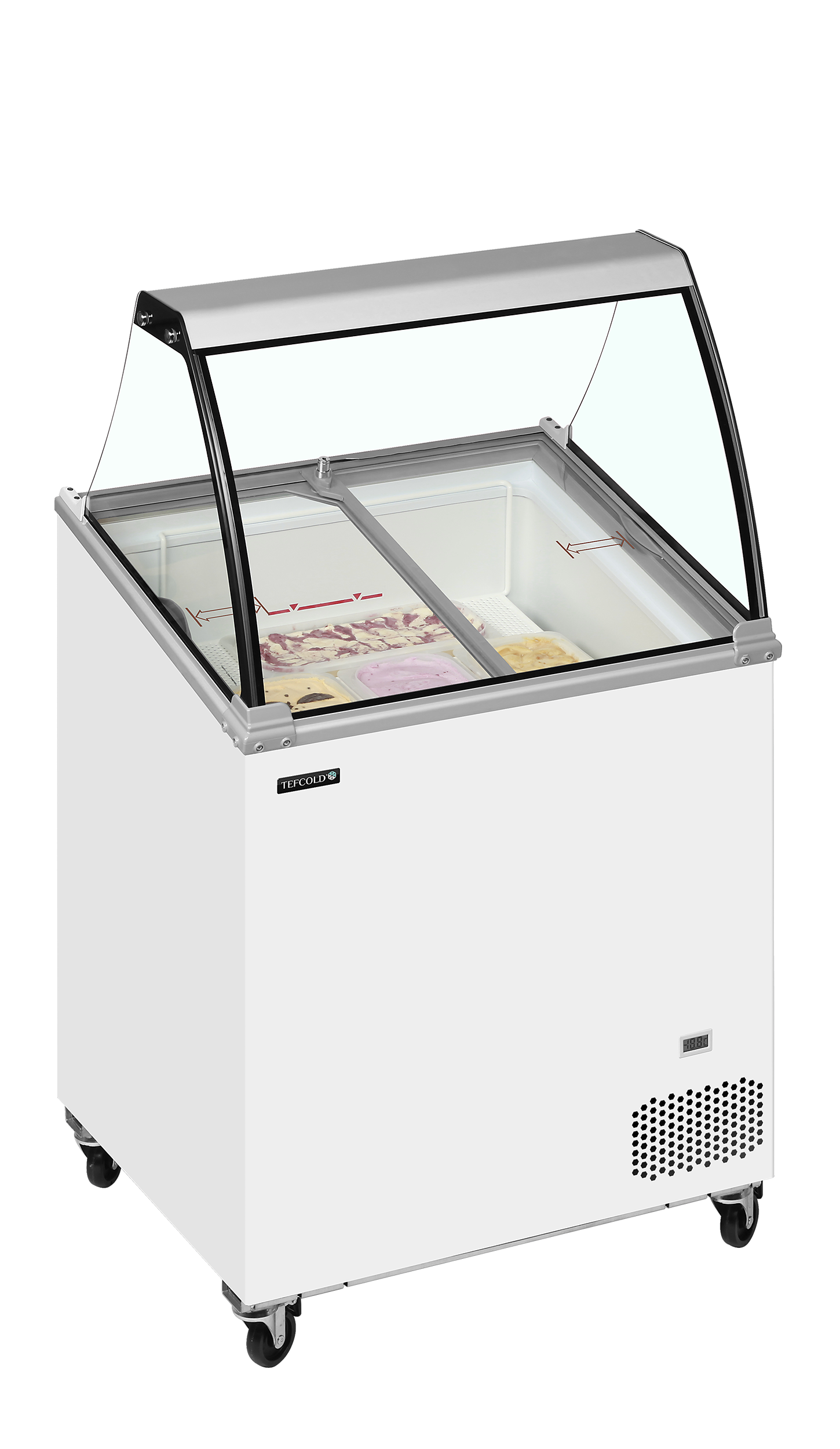 The IC201SCE + CANOPY features a curved glass canopy and angled sliding lids with locks, ensuring optimal product visibility and security. This unit is perfect for branding and offers storage under baskets, a digital thermometer, and castors with brakes for easy mobility. With a climate class 5 rating, it excels in high performance even in warm environments. Additionally, it accommodates plastic Napoli size tubs, eliminating the need for stainless Napoli pans.