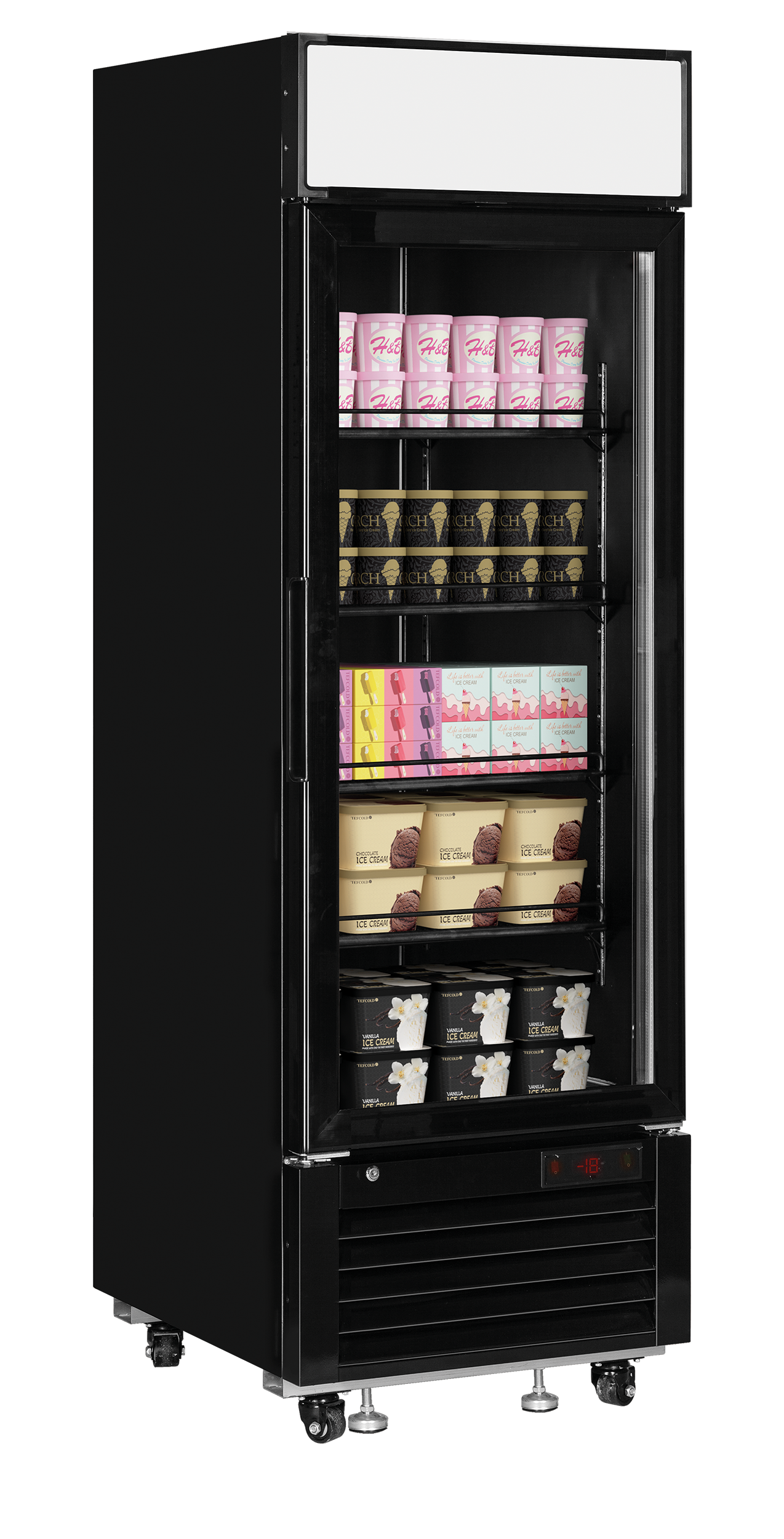 The TEFCOLD LGF glass door freezers are available in single, double, and triple-door units, with matching chiller versions. These robust cabinets feature two vertical LED light strips and a large LED light canopy. They are designed with a stainless steel base for easy cleaning. The energy-efficient refrigeration system minimizes running costs, making them cost-effective. Equipped with castors and locking feet, these versatile units are ideal for storing frozen foods and ice cream at a great price.