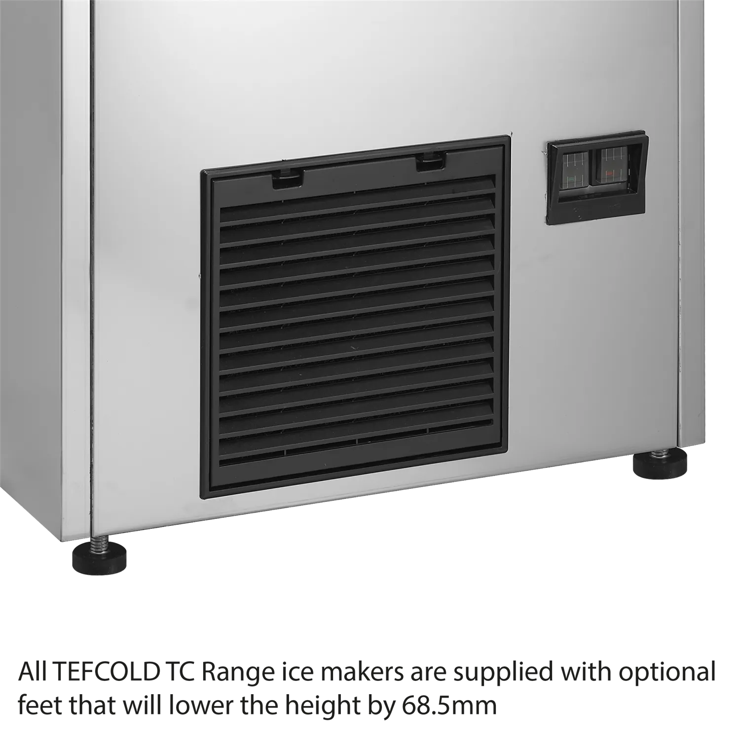 The unit is designed with an integral, quiet-running magnetic water pump to remove excess water, offering flexibility in installation as it does not need to be located directly above a drain. Additionally, the ice maker is equipped with adjustable legs and small adjustable feet, allowing the height to be lowered by 68.5mm if necessary. The TC range is ideal for use in cafes, restaurants, pubs, bars, fast-food venues, and other hospitality establishments that require cubed ice for drinks or other purposes.