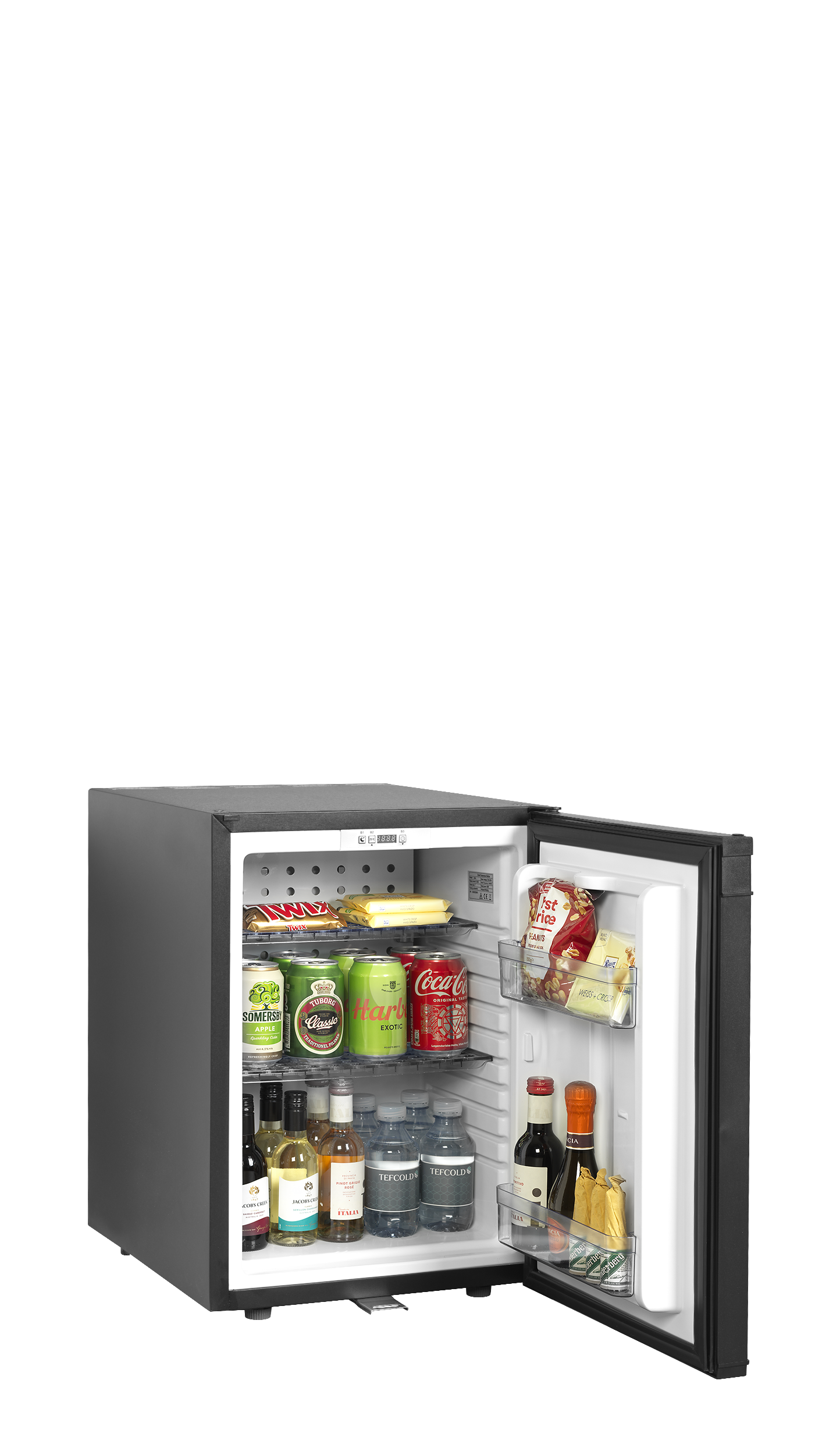 The TM-C range of hotel minibars from TEFCOLD offers an innovative alternative to the traditional "absorption" refrigeration systems commonly found in many minibars. The TM-C model features a compressor refrigeration system that significantly reduces energy consumption while providing faster cooling of products. The unit operates quietly at 38dB, and with smart programming, it can be set to function during periods when the room is likely to be unoccupied, such as between 11 am and 4 pm.