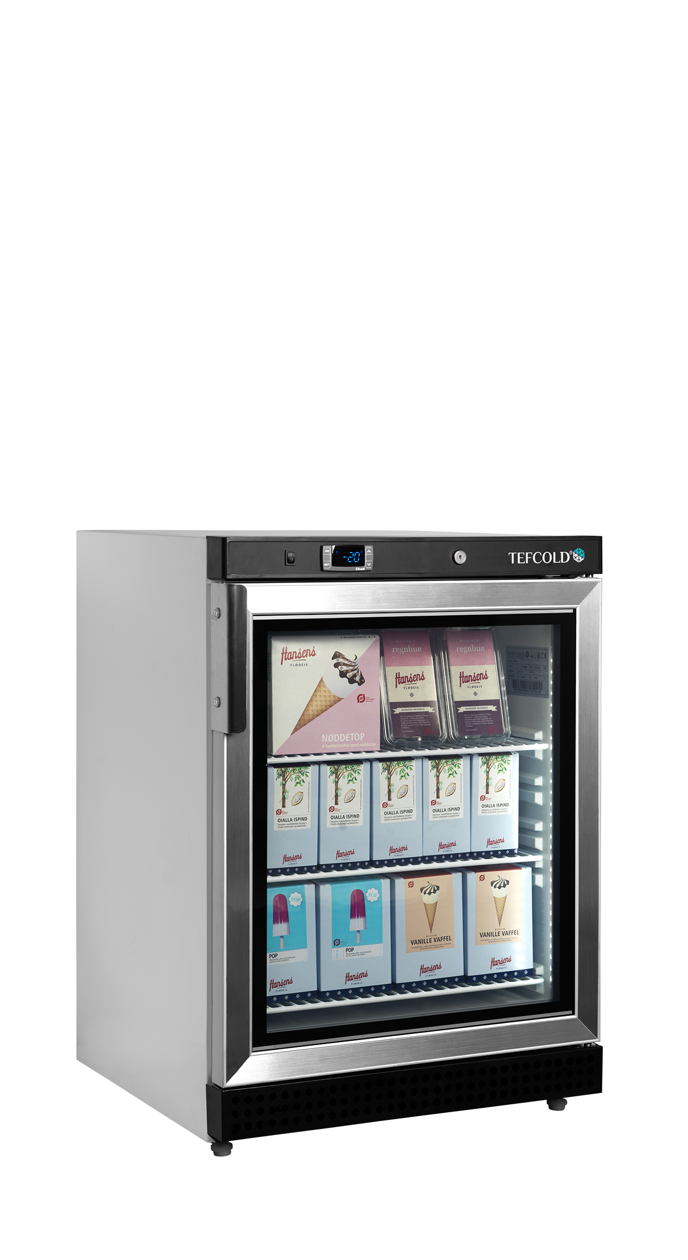 The UF-VG range of display freezers is the ventilated version of our white glass door freezers. It comes in a variety of sizes and offers great flexibility with adjustable shelves. The effective ventilated refrigeration system ensures an even temperature throughout the cabinet. The temperature can be set on an easy-to-use digital thermostat display. Defrost happens automatically.