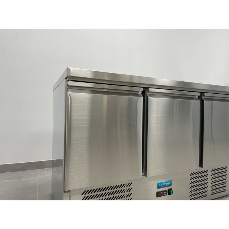 The Unifrost CRS136G 3-Door Counter Fridge is a versatile and efficient solution for commercial kitchens, combining ample refrigerated storage with a durable stainless steel worktop. Its spacious three-door design accommodates GN 1/1 pans, while the fan-cooled interior ensures consistent temperature distribution, maintaining food freshness. The fridge features a user-friendly digital controller for precise temperature management, ranging from +2°C to +5°C, adhering to food safety standards. Crafted with energy efficiency in mind, it uses eco-friendly R290 refrigerant for reduced environmental impact. With a robust stainless steel top offering a hygienic workspace, dimensions of W1360 x D700 x H890 mm, and a 370-litre capacity, this unit is a reliable and space-saving addition to any professional kitchen.
