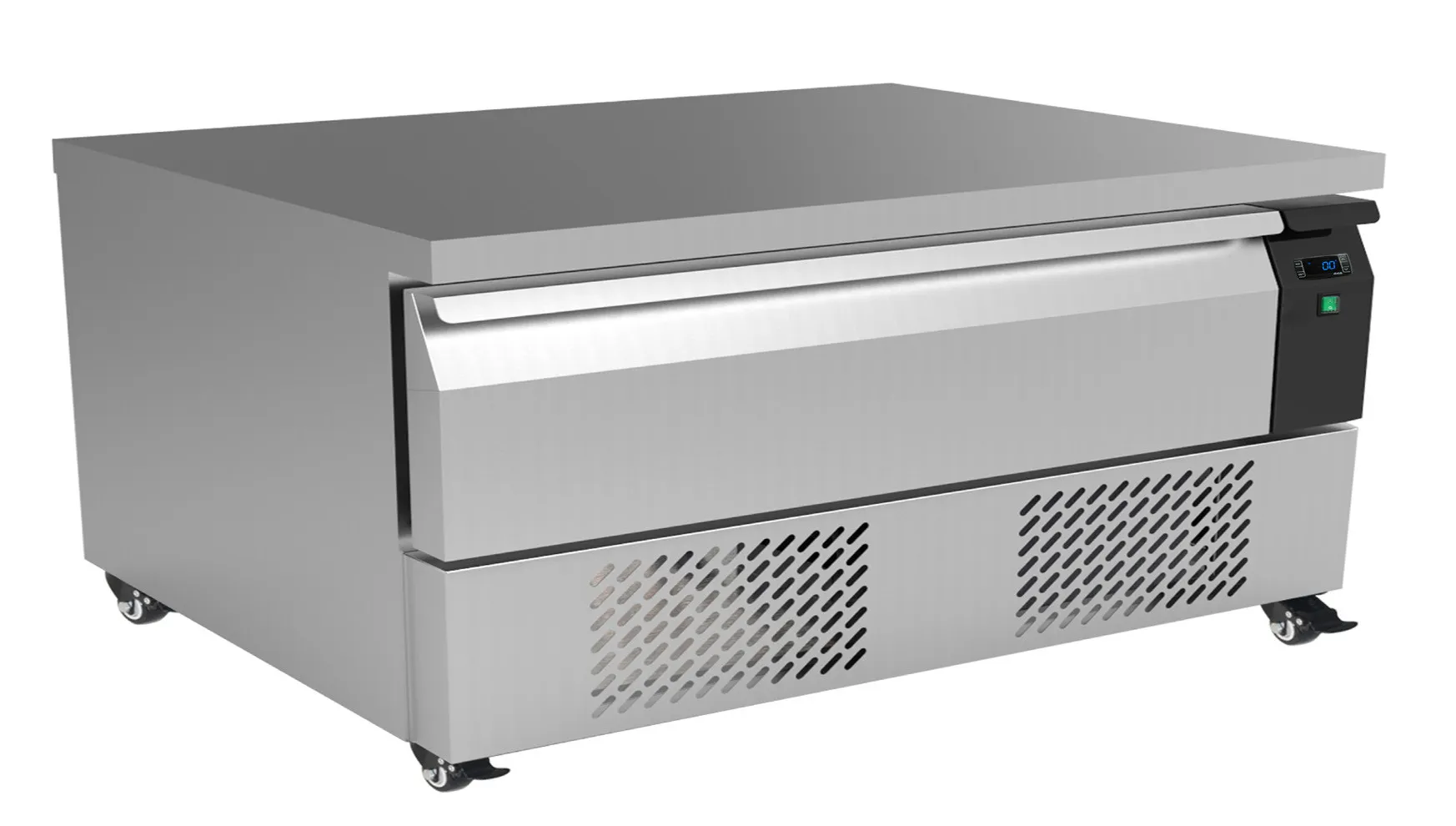 Highly accessible frozen or chilled food is conveniently located under cooking or other equipment. This innovative refrigeration solution saves time and can also serve as a base for combi ovens.
