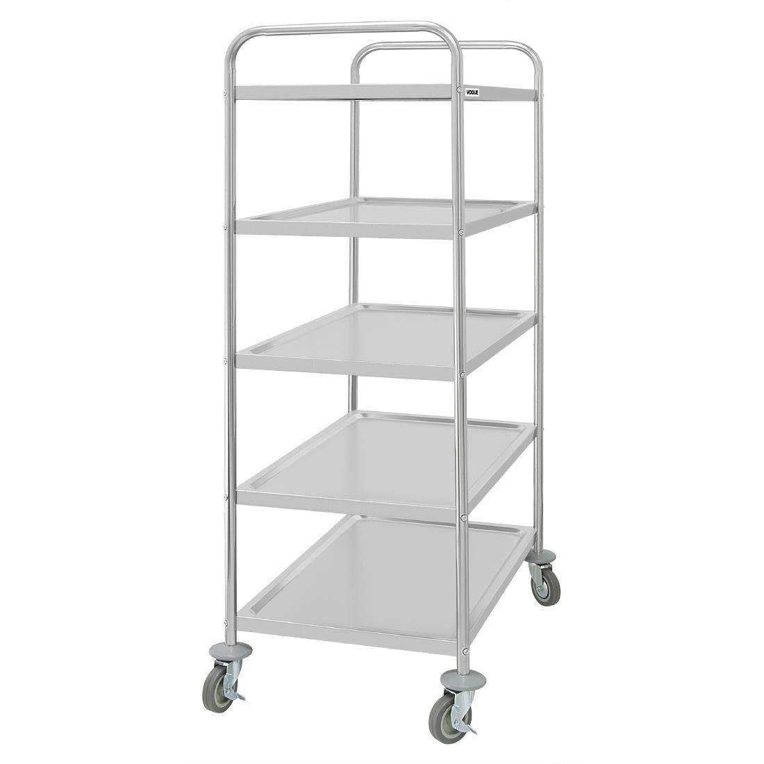 Strong and durable, the large size five tier Vogue trolley is a great solution for transporting items between areas. Constructed from stainless steel throughout, the trolley is both easy to clean and maintain and provides a hygienic base to transport items, whether that's utensils, plated meals, drinks dispensers, linen or cleaning materials. The trolley is incredibly easy to assemble and includes four heavy duty castors, two of which include strong brakes to prevent the trolley from moving - perfect if you need to position the trolley in a sloped area. And thanks to the indentation on each tier, items are prevented from falling off during transportation. The indentation also ensures any spilt liquids are kept on the trolley, rather than leaking onto the floor - a time-saving addition to your site safety.