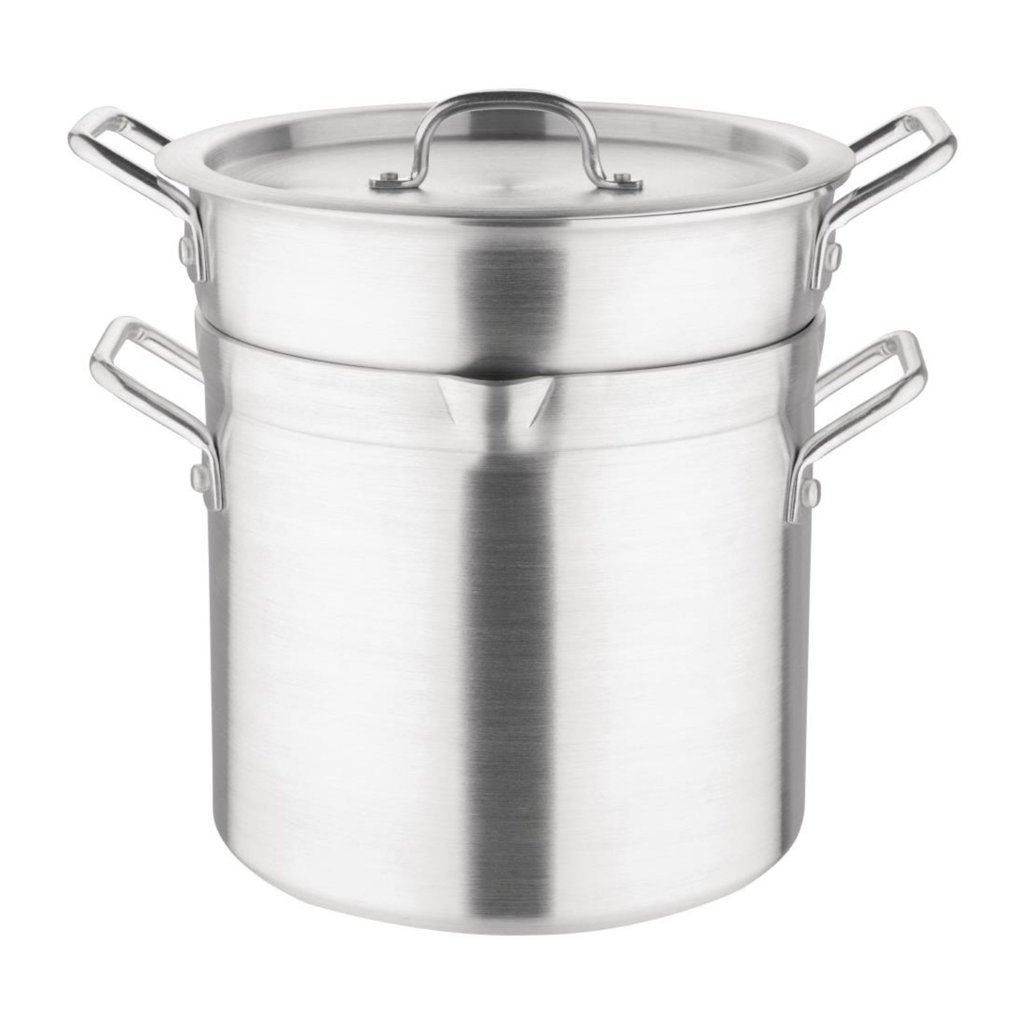 Melt chocolate to perfection or cook delicious sauces with this Vogue double boiler pan. Made from aluminium, the pan's high heat retention helps to distribute heat across both of the pans for even cooking. The double pan design reduces the amount of space that two separate pans would take up on a cooktop, so you can cook twice the amount of ingredients without using twice the amount of space. The pots are also designed so one is able to be placed inside the other even while cooking.