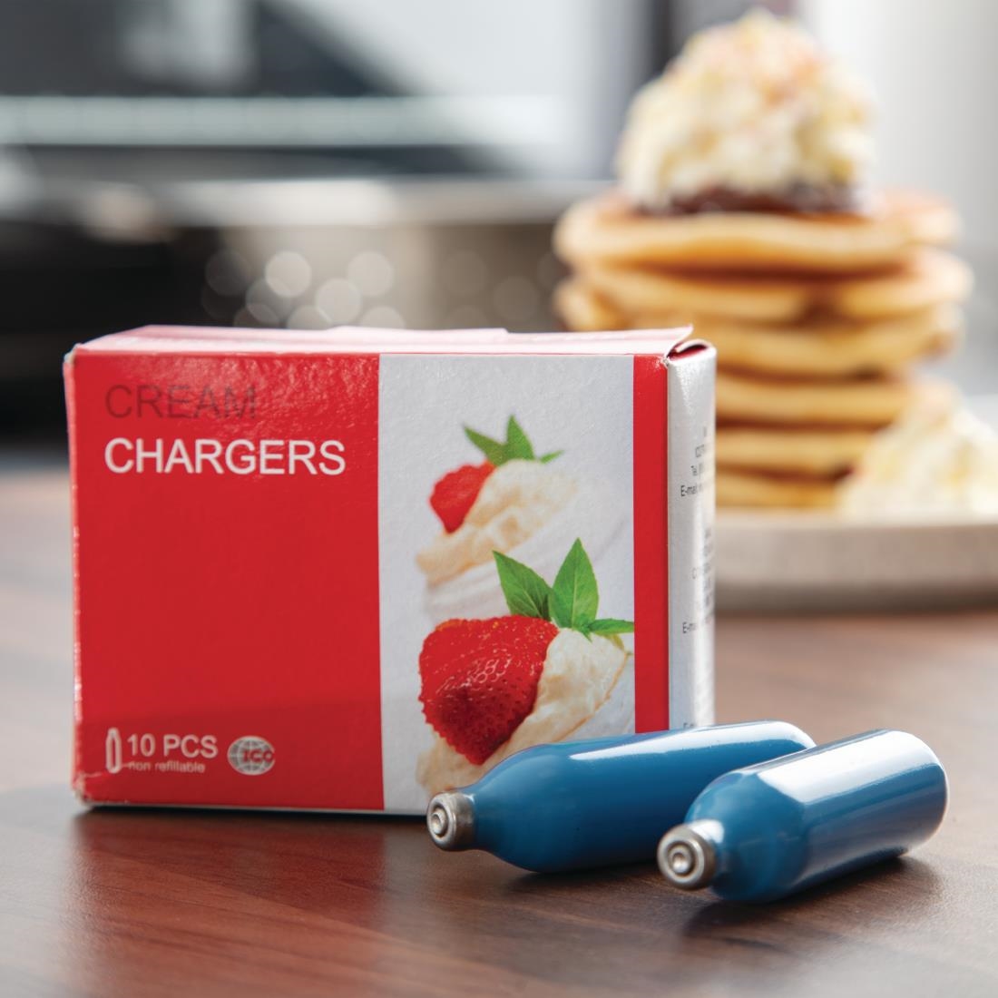 Create light, fluffy whipped cream in seconds with Vogue cream whipper bulbs. These bulbs are remarkably easy to fit, allowing you to effortlessly apply doses of luxurious fresh cream to your desserts, drinks, and dishes. This feature speeds up your serving times, helping you meet demand during busy periods. Supplied in a pack of 10, these bulbs are perfect for topping up your supply at an affordable price, making them ideal for any small restaurant, coffee shop, or café. These bulbs are compatible with the CB162, K637, and GG485 cream whippers.