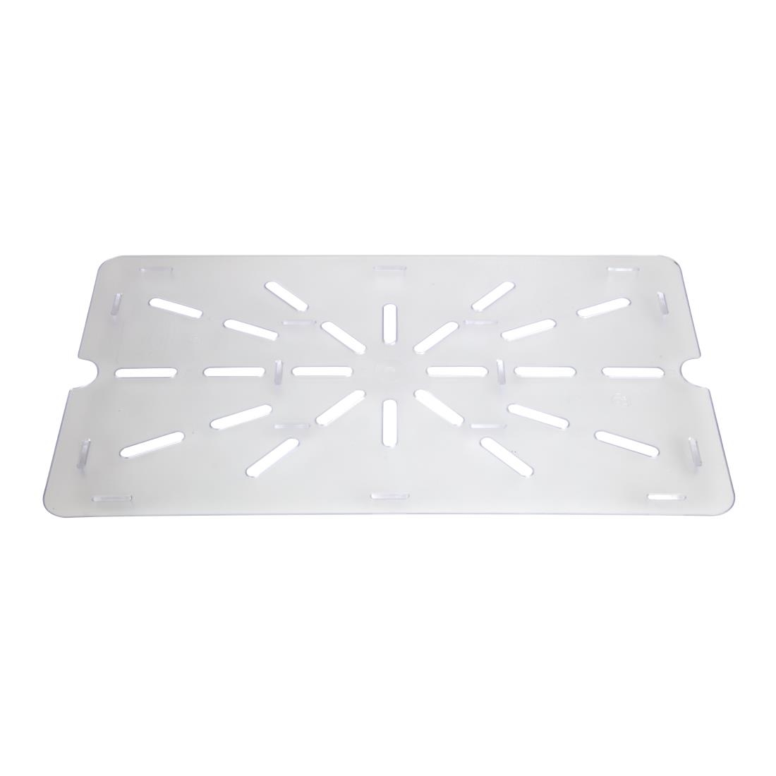 Drain your food of juices and liquid with this Vogue drainer plate. This drainer plate is a great piece of equipment for draining food in a gastronorm container. Simply place the drainer plate at the bottom of the gastronorm and put food on top, allowing the juices to go through the drain holes in the plate. Constructed from strong polycarbonate, the box is very robust and durable, enabling it to withstand many years of heavy-duty usage, thus limiting your need to buy replacements. The drainer is dishwasher safe, allowing you to put it straight in your dishwasher and save time on manual washing. This practical drainer plate from leading brand Vogue is designed for 1/1 sized polycarbonate gastronorms.
