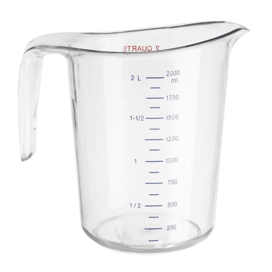 Measure and pour liquids quickly and accurately with the 2-liter polycarbonate measuring jug from Vogue. Marked in both milliliters and fluid ounces, you can easily identify how much liquid has been poured, no matter your preferred unit of measurement. Thanks to its durable polycarbonate construction, the jug is shatter-resistant, helping to extend its lifespan, especially in busy kitchens. Additionally, with its easy-pour spout, the contents of the jug can be poured into dishes mess-free, preventing spills and reducing clean-up times. This is an essential jug for the professional kitchen.