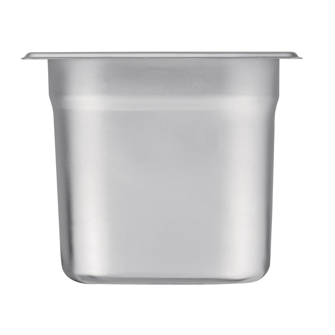 Prepare, cook, and store your food with this Vogue stainless steel 1/9 GN pan (150mm/1Ltr). Featuring an overhanging rim, this pan is particularly useful for slotting into a buffet station or preparation unit for quick and easy access to foods. Constructed from stainless steel, the pan resists warping and shattering, enabling it to withstand years of commercial kitchen usage, which saves you money on buying replacements. The corners are also particularly strong to avoid damage from knocks and weight. The stainless steel is a stylish alternative to plastic and looks great on a front-of-house buffet station. This is a top-quality pan from the professional catering brand Vogue.