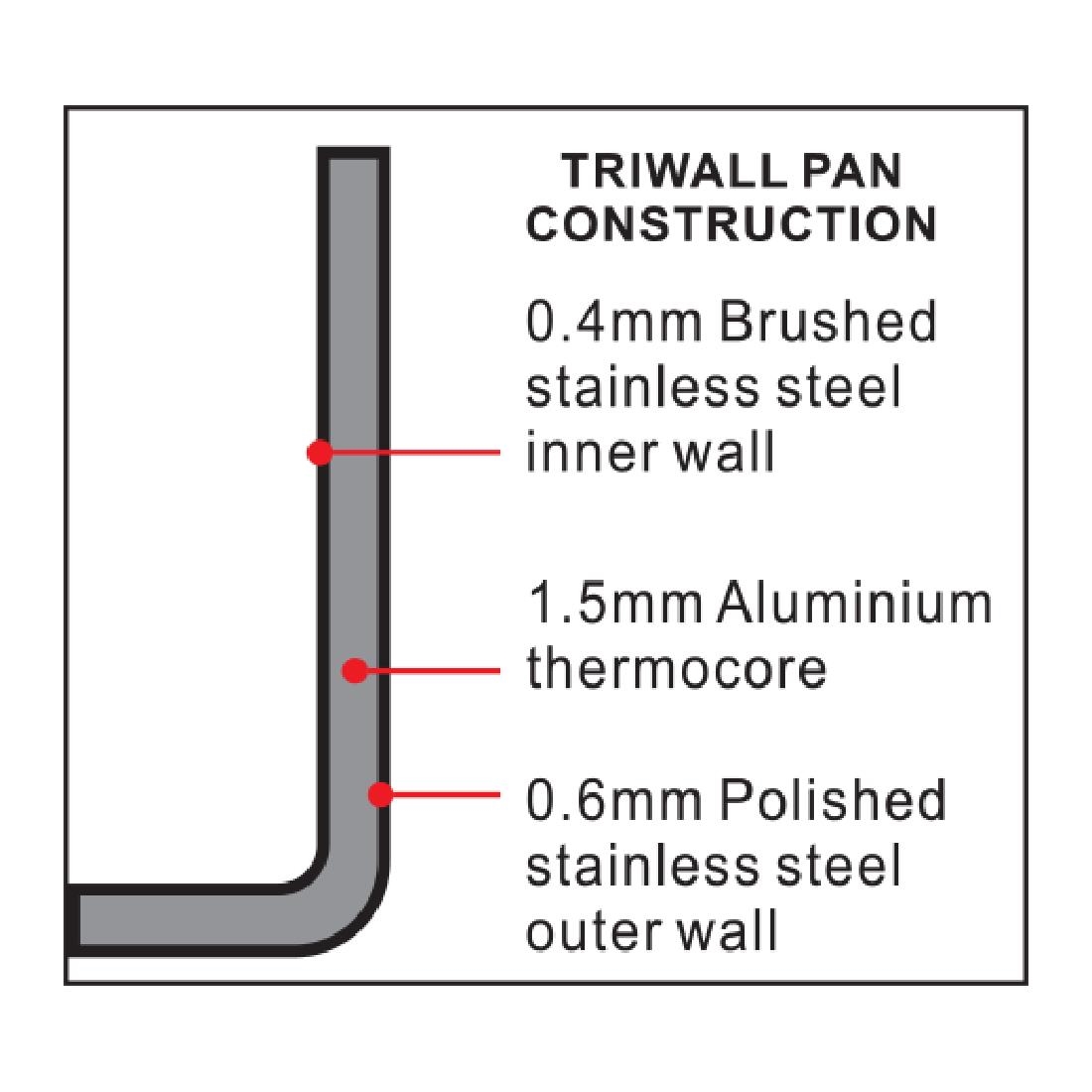 Innovative aluminium thermocore sandwiched between stainless steel walls provides even heat distribution without hotspots for great performance. Hardwearing mirror polished exterior with brushed finish interior.
