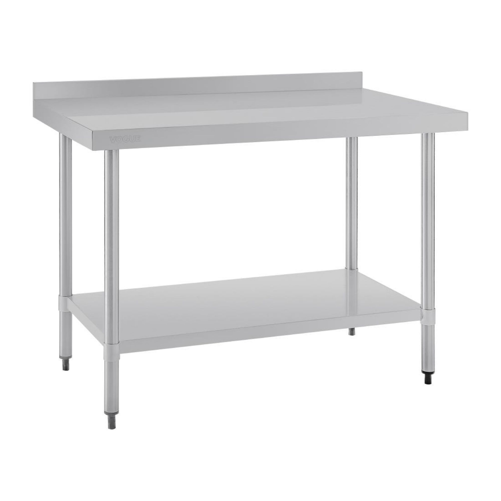 Give kitchen staff extra space with this 1200mm stainless steel prep table from Vogue. Featuring an upstand, the table is ideal for installation against the wall - stopping any food or utensils from falling down behind or splashing of food where it is hard to clean.